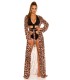 Upeasti laskeutuvaa materiaalia oleva leopardi rantakimono on täyspitkä, ihan maahan asti (itse olen 168cm M-kokoa). Yllätyksekseni leopardikuosista ei oikeastaan näy läpi vaikka kangas on kevyt. <br /> Hihansuissa kauniit kiristykset. Kimonossa ei ole edessä kiinnitysmekanismia ja se onkin tarkoitettu avoimeksi mukana tulevan samaa kuosia olevan vyön kanssa käytettäväksi.
