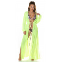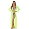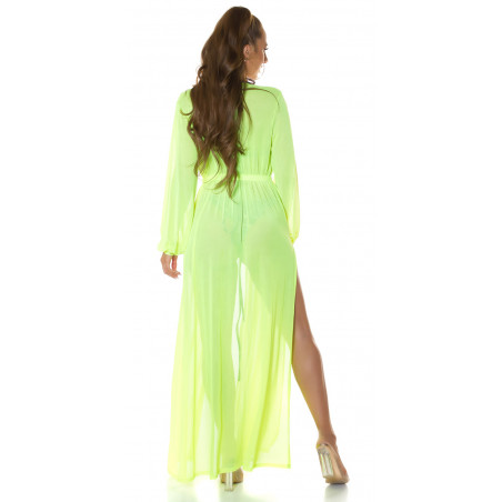 Neongul långärmad lång öppen mesh kimono med slitsar och guldbältesband.