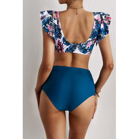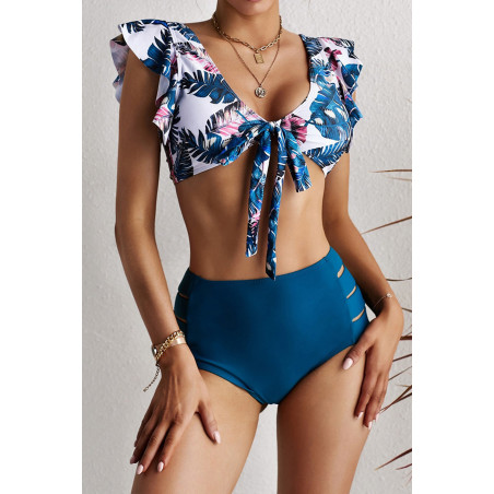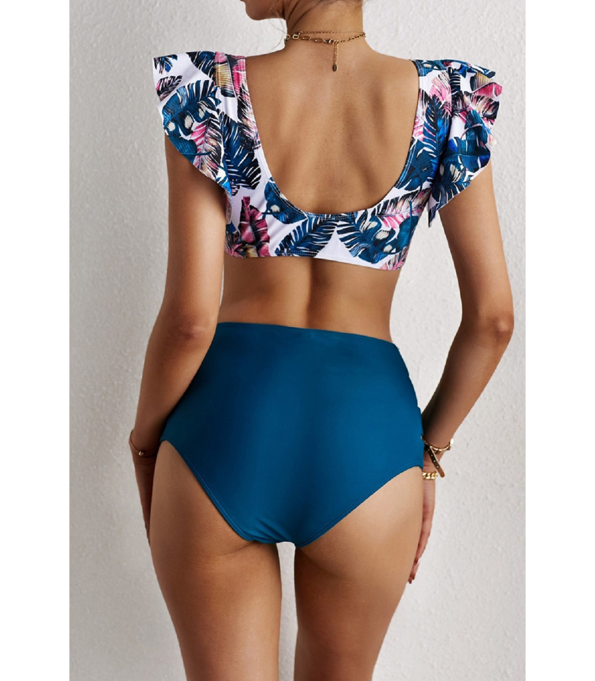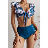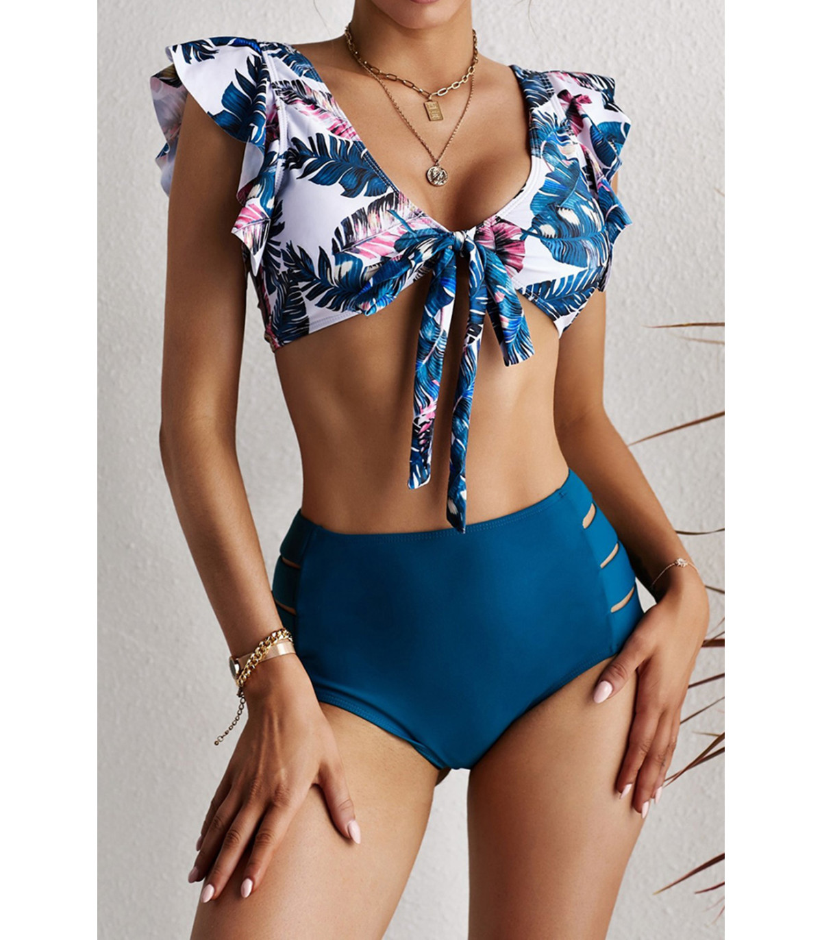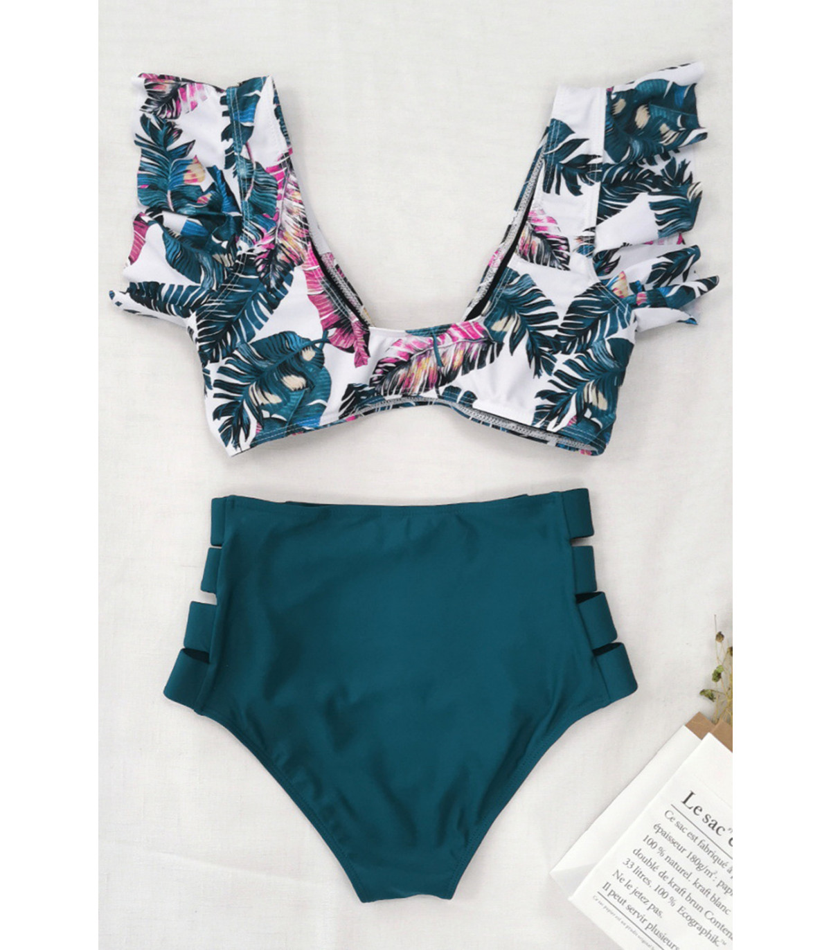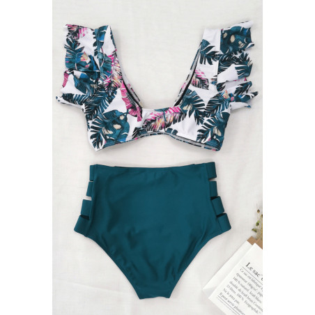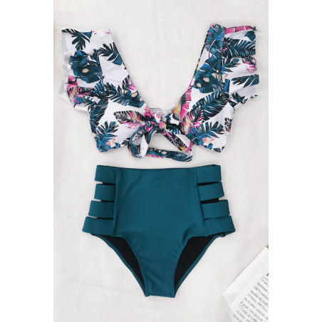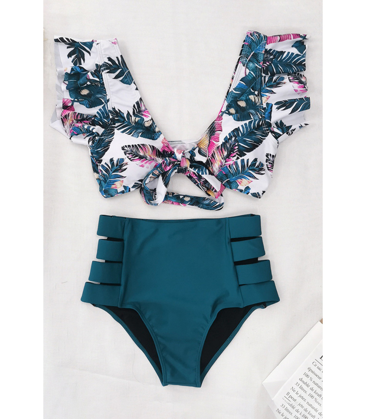 Vit bladmönstrad volangknuten V-bikini framtill och matchande mörkgröna bikinibyxor med hög midja och slitsar Modellen är också lämplig för bröstskador. Andra storlekar finns för närvarande inte i lager.
