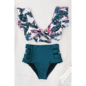 Mörkgrön lövmönster bikini med hög midja med slitsar
