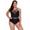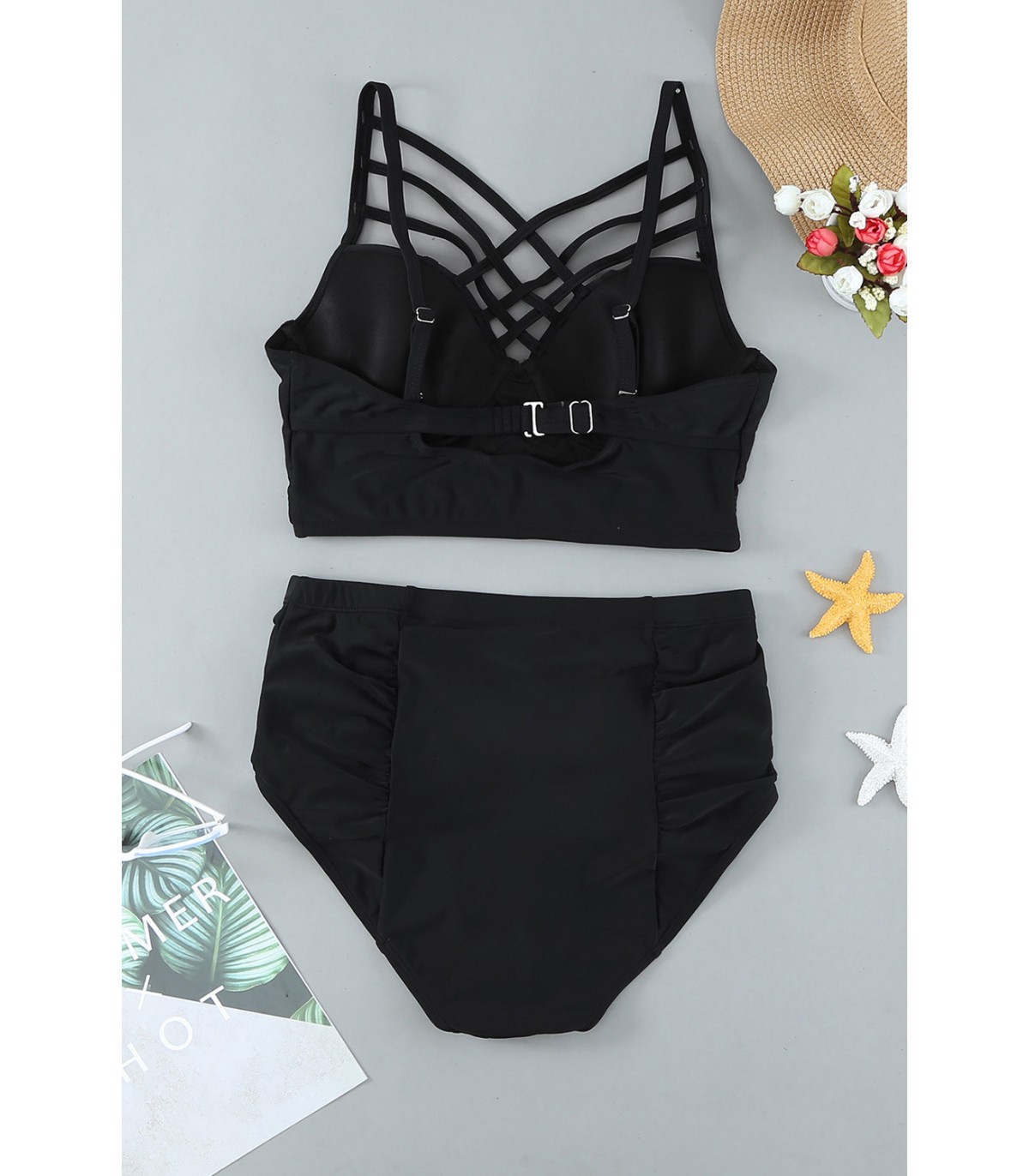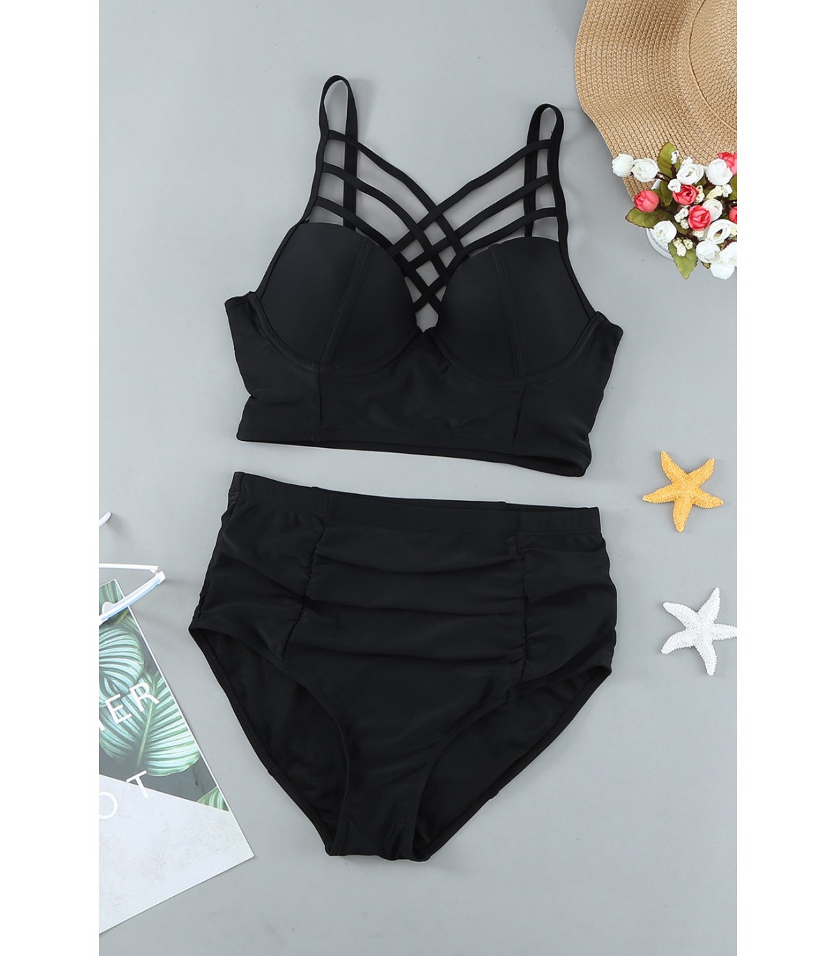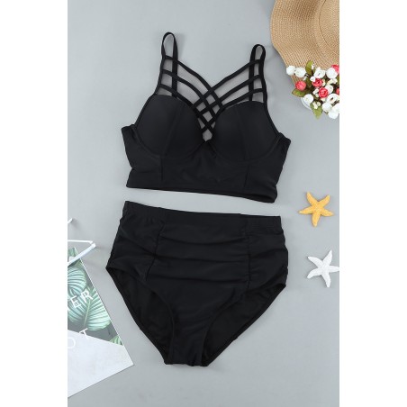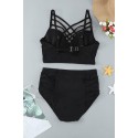Svart gitter-inkapslade bikini och matchande bikiniunderdelar med hög midja. En vadderad bikini passar bäst för bröst. Om du undrar mellan två storlekar, ta en mindre storlek.