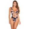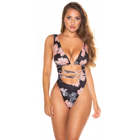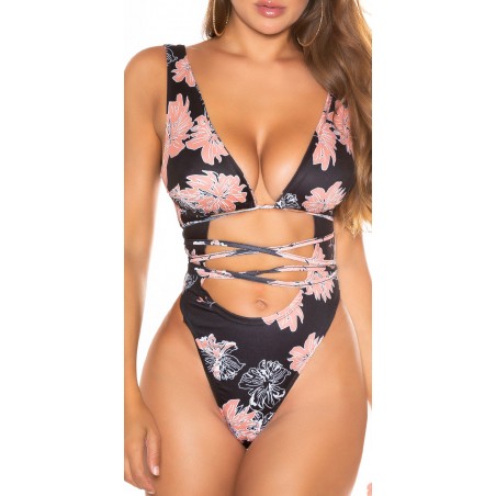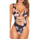 Svart blommig mönstrad högbensbandad v-baddräkt