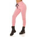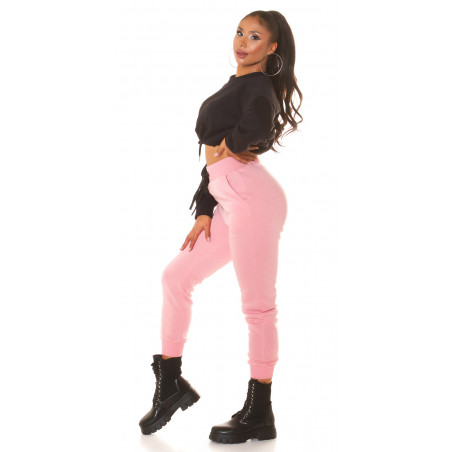 Rosa joggingbyxor med hög midja och fickor fram och svarta snören. Dessa prisvärda joggingbyxor med fickor är ett bra val när du letar efter bekväma loungebyxor som är enkla men spektakulära. Byxorna med hög midja är bekväma att bära, så de är perfekta för hela dagen. I tjusiga bobyxor vågar du också lämna hemmet eller ta emot gäster. För en trendig sportig avslappnad look, kombinera rosa joggingbyxor med en kort hoodie eller sweatshirt. Den korta tröjan med band på bilderna säljs separat och finns i fem olika färger. Rosa loungebyxor ser också bra ut med en svart eller vit kort topp, till exempel. Svarta band ger prålighet till annars monokroma joggare.