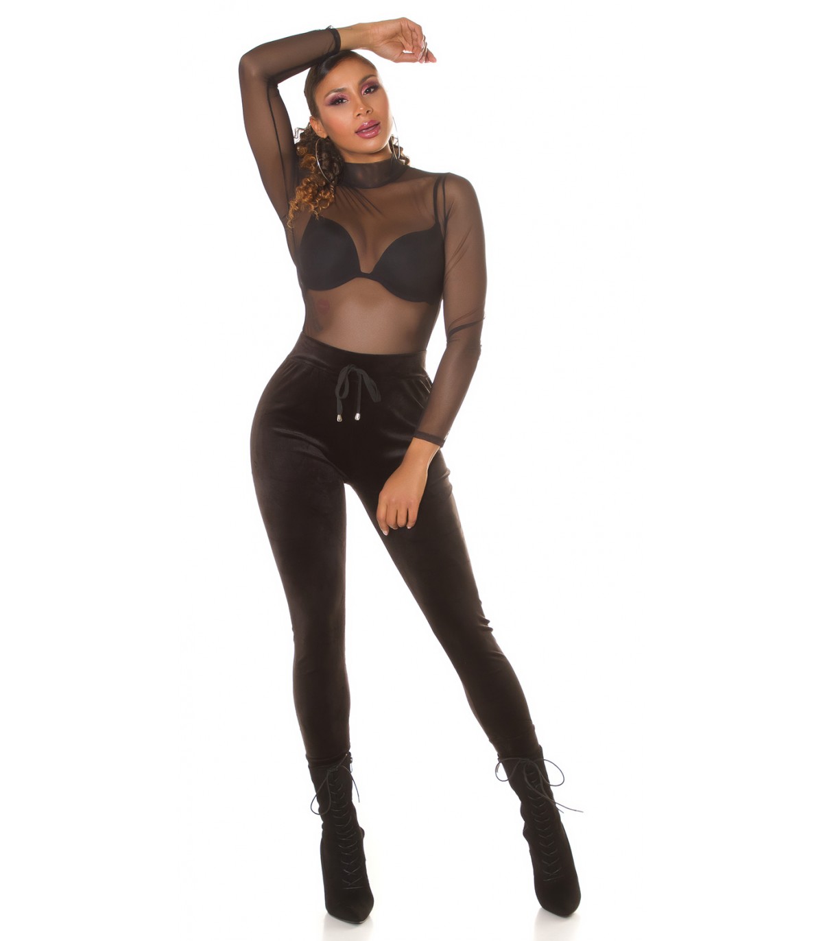 Svarta joggare med hög midja i sammet. Lämplig för fullfjädrade på cirka 160 centimeter. Höftomkretsen motsvarar den normala storleken, midjemåttet är något mindre storlek.