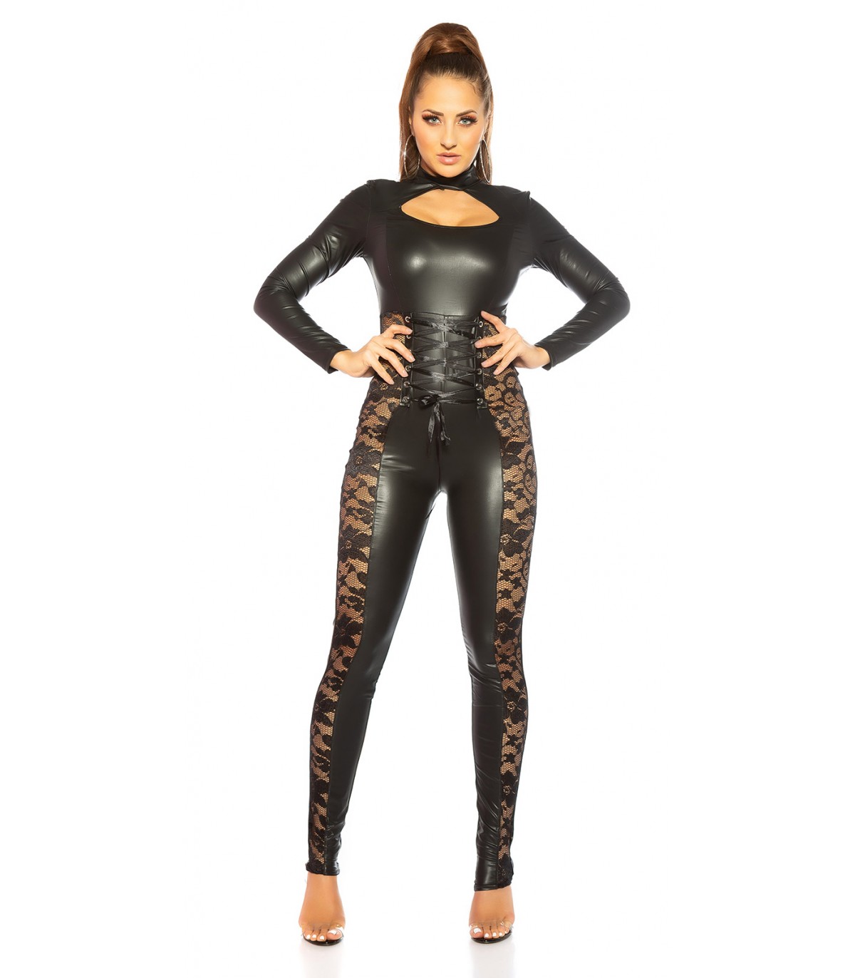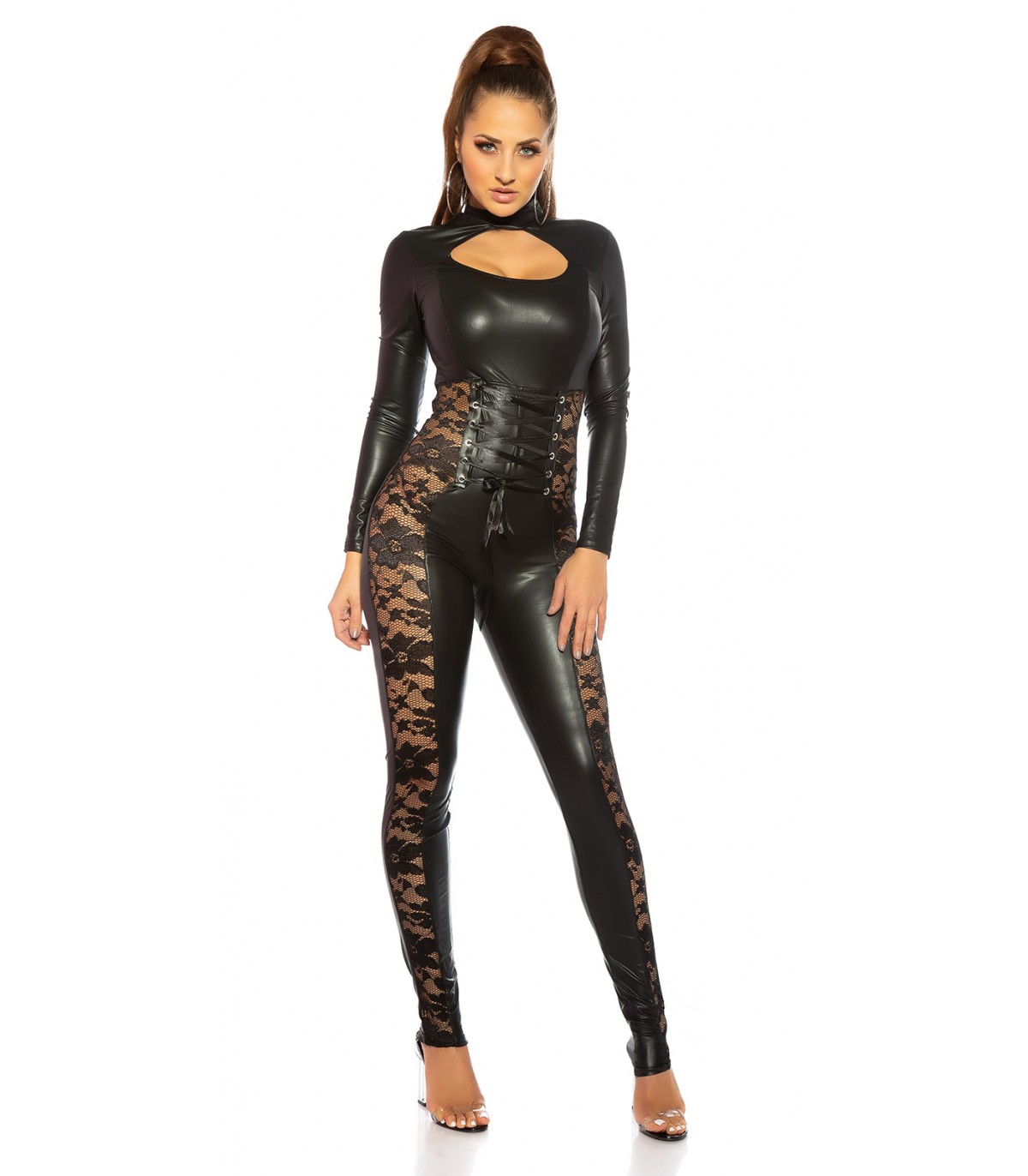 Svart spets och sladdtrimmad wetlook catsuit med titthål. Passar bäst för ca 165-170 centimeter.