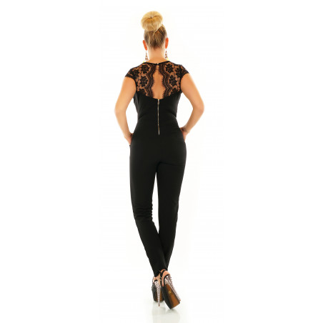 Musta pitsikoristeinen v-jumpsuit vyöllä