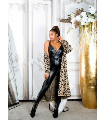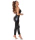 Svart tvåaxlad faux läder v-jumpsuit med bälte.