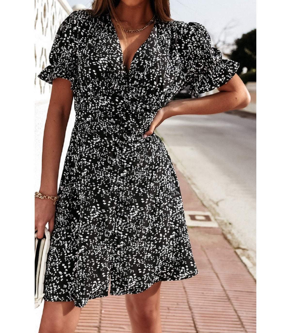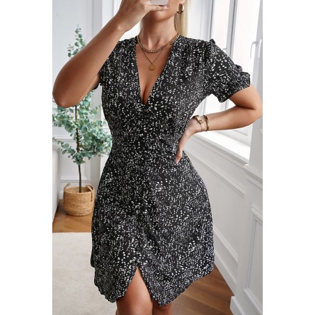 Svart och tryck mönster kortärmad v-klänning med knappar
