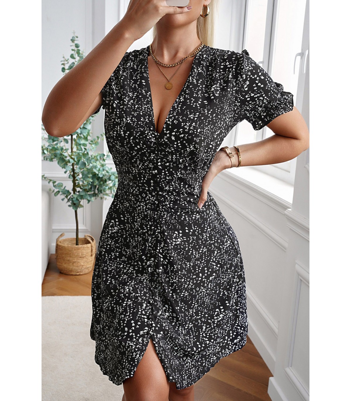 Plus de details Valittu koko loppu varastostaSvart och tryck mönster kortärmad v-klänning med knappar