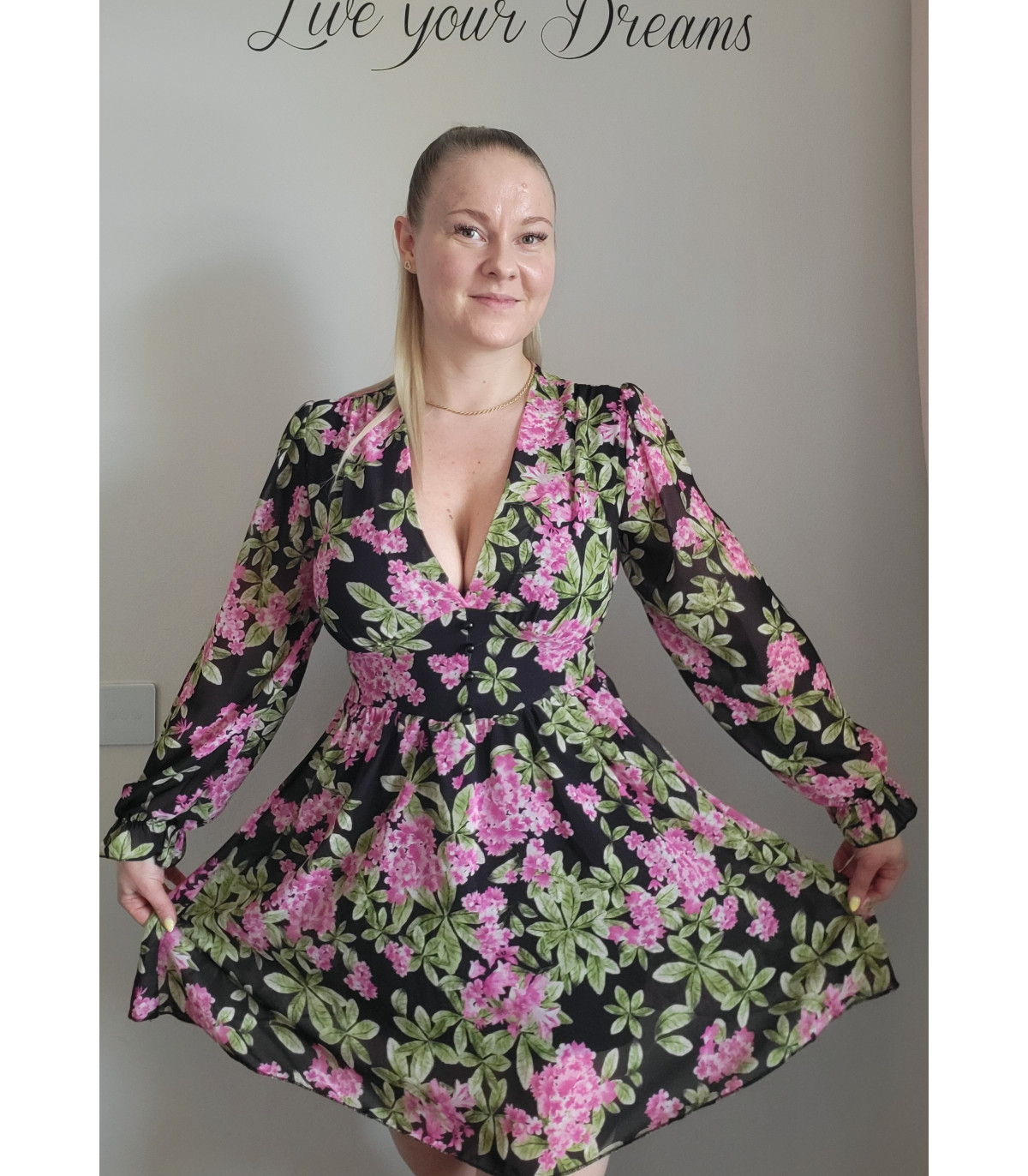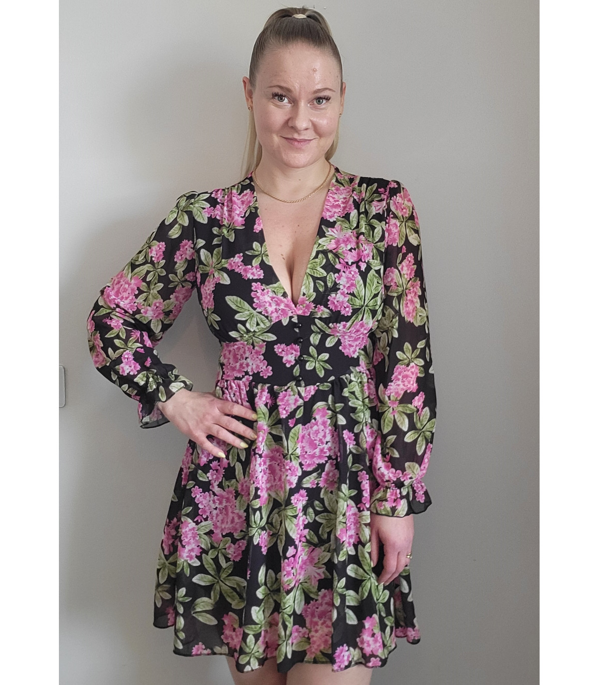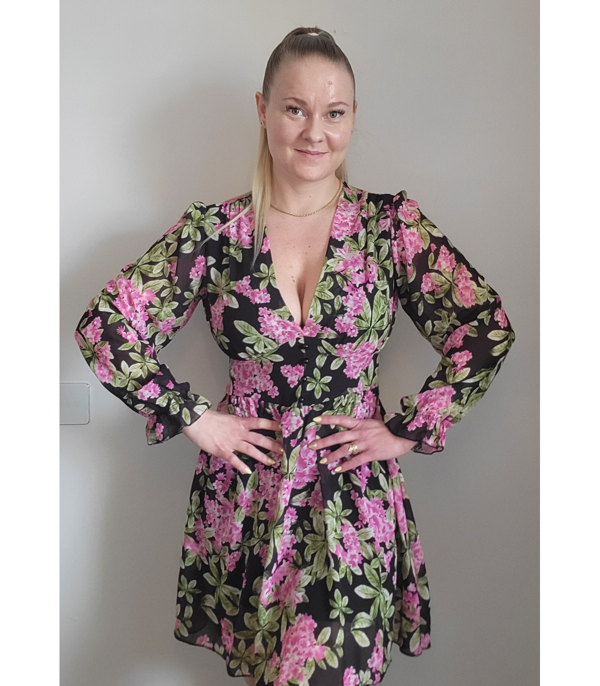 Elle Style Juliette musta kukkakuvioinen mekko helminapeilla