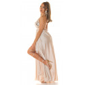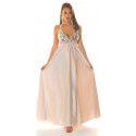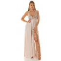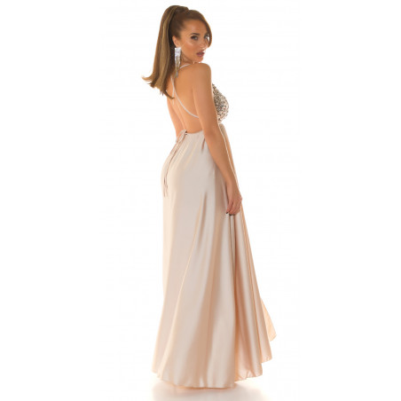 Koucla beige lång satinlook V-party klänning med paljetter