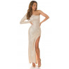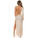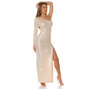 Guld enärmad lång glitterklänning med spektakulär kedjekantad rygg, kedjeband och slits. En spektakulär glitterklänning med spektakulära detaljer kommer att fånga ögat. En klänning som glittrar i ljuset är en billig men spektakulär galaklänning. En kedjetrimmad, enärmad glitterklänning med slits är lämplig för olika fester och tillfällen som kräver spektakulära, festliga klänningar. En enärmad festklänning med öppen rygg och kedjedekoration sticker ut från mängden. Glittrande glitter sätter sin egen prägel på klänningen. Den guldglittriga klänningen är elegant sexig. Under en klänning med öppen rygg kan du få bröststöd med kavajslag eller en diskret bh. Höga klackar och en liten väska fulländar den festliga stilen.