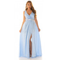 Koucla ljusblå V-satin maxiklänning med slits och strassbälte