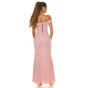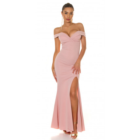 Rosa axelavslöjande off-shoulder lång festklänning med slits. Klänningen har vadderade kuppartier, så du behöver inte nödvändigtvis en bh under den.