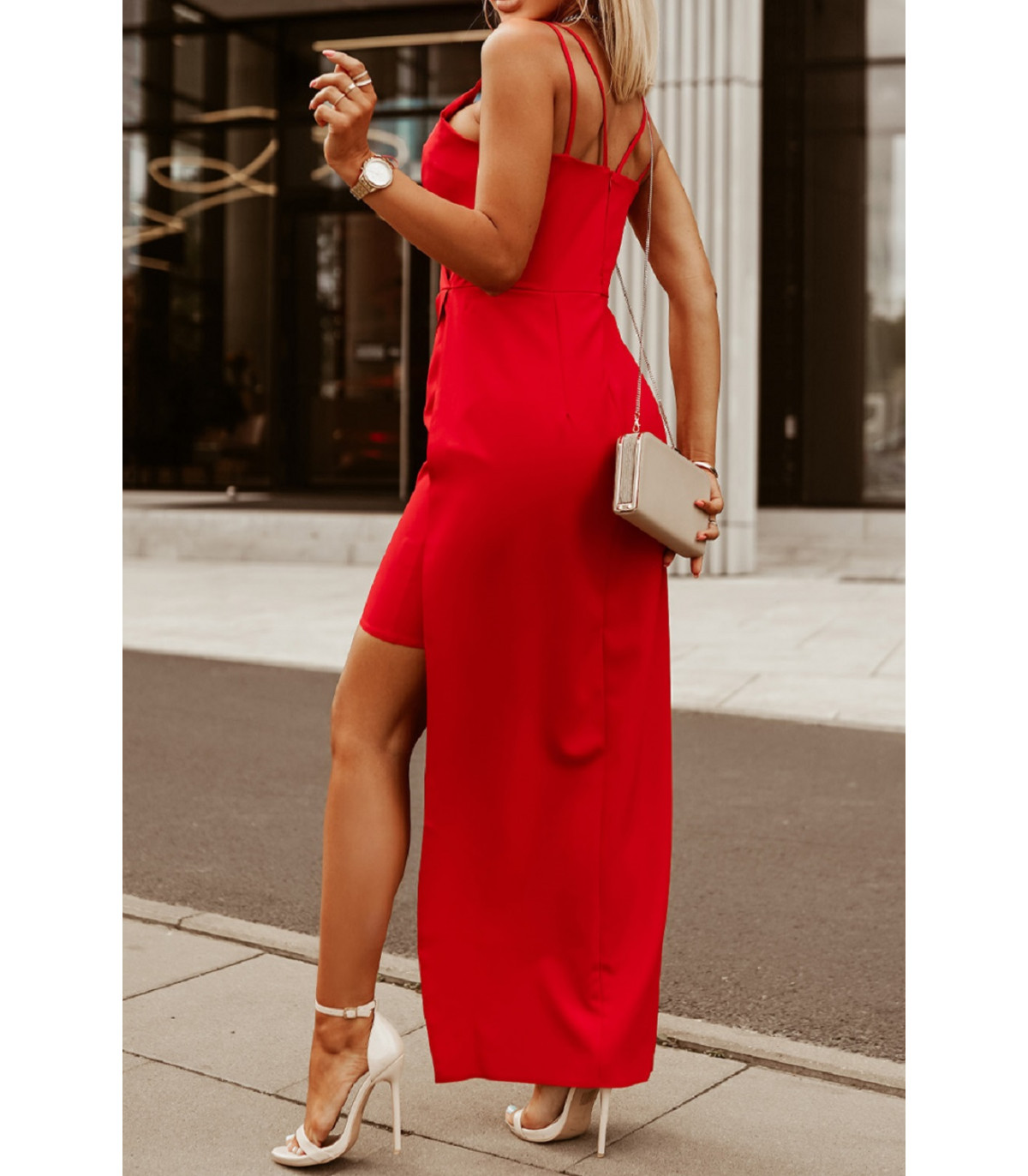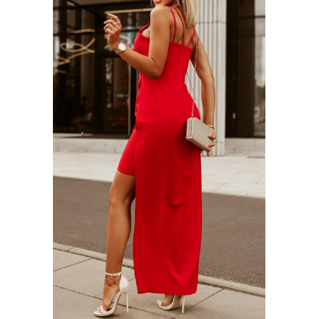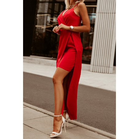 Röd omlott-look v-klänning med slits