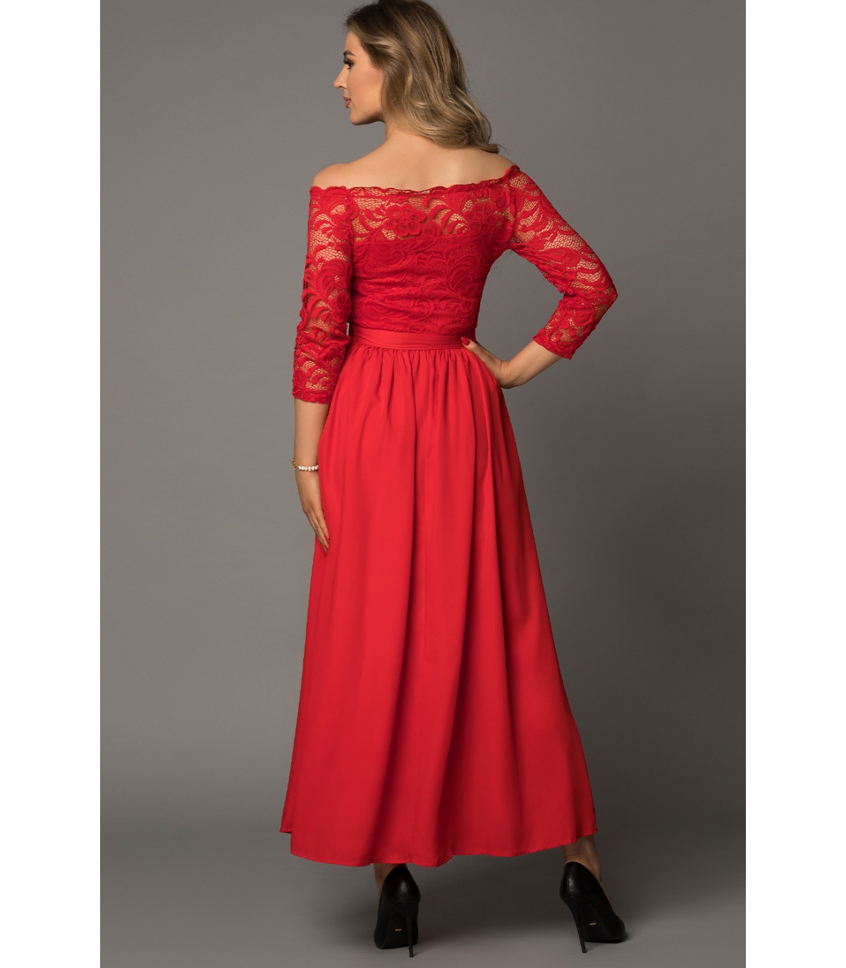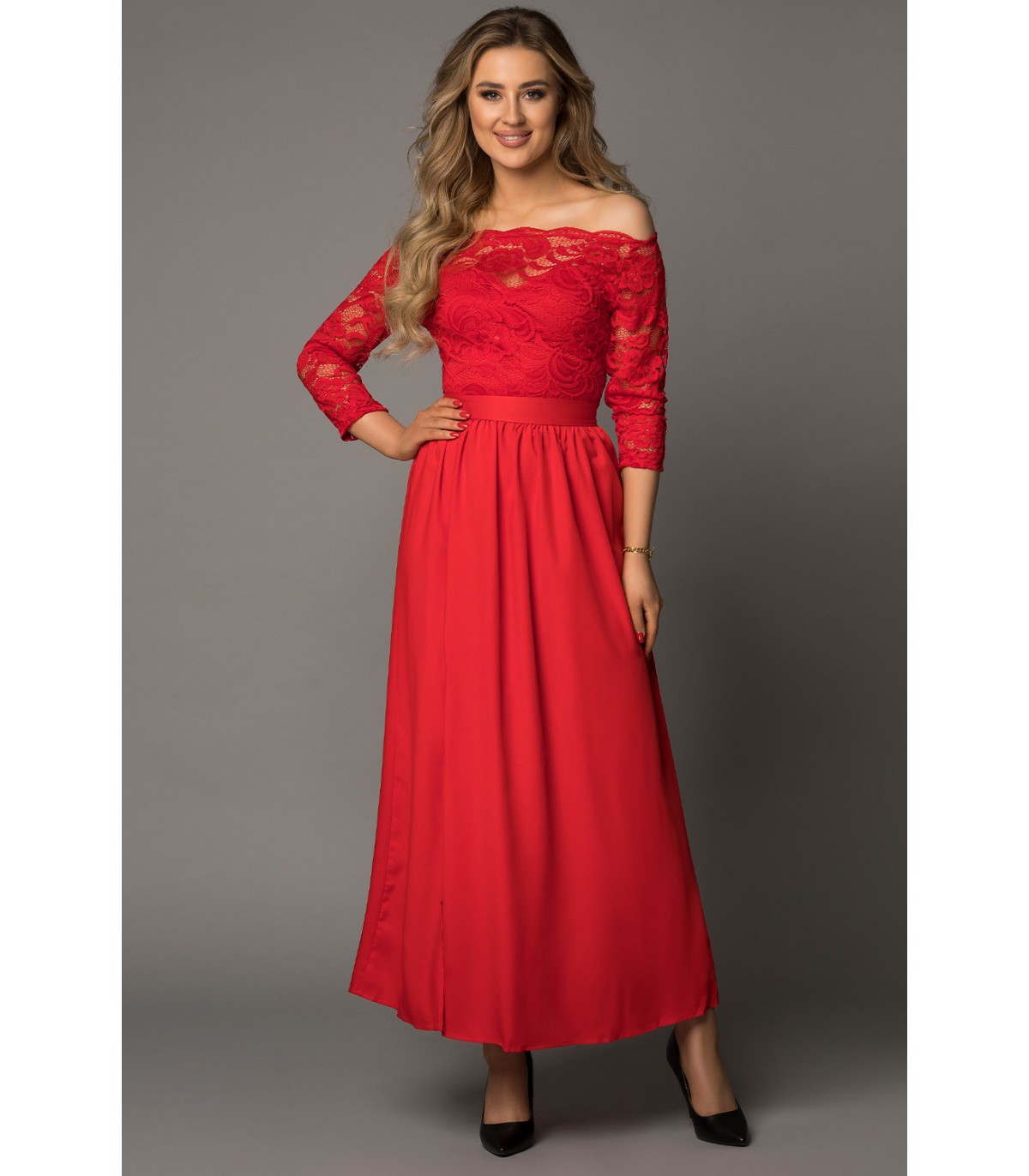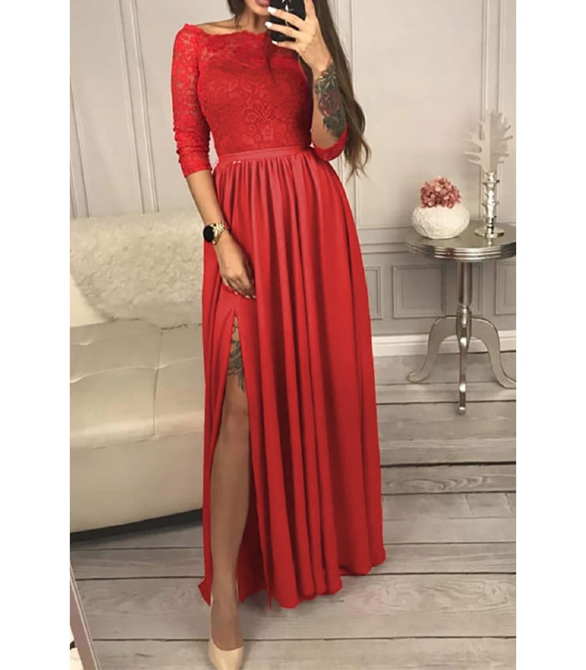 Röd lång festklänning med spets och slits [DISCOVERY]