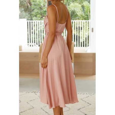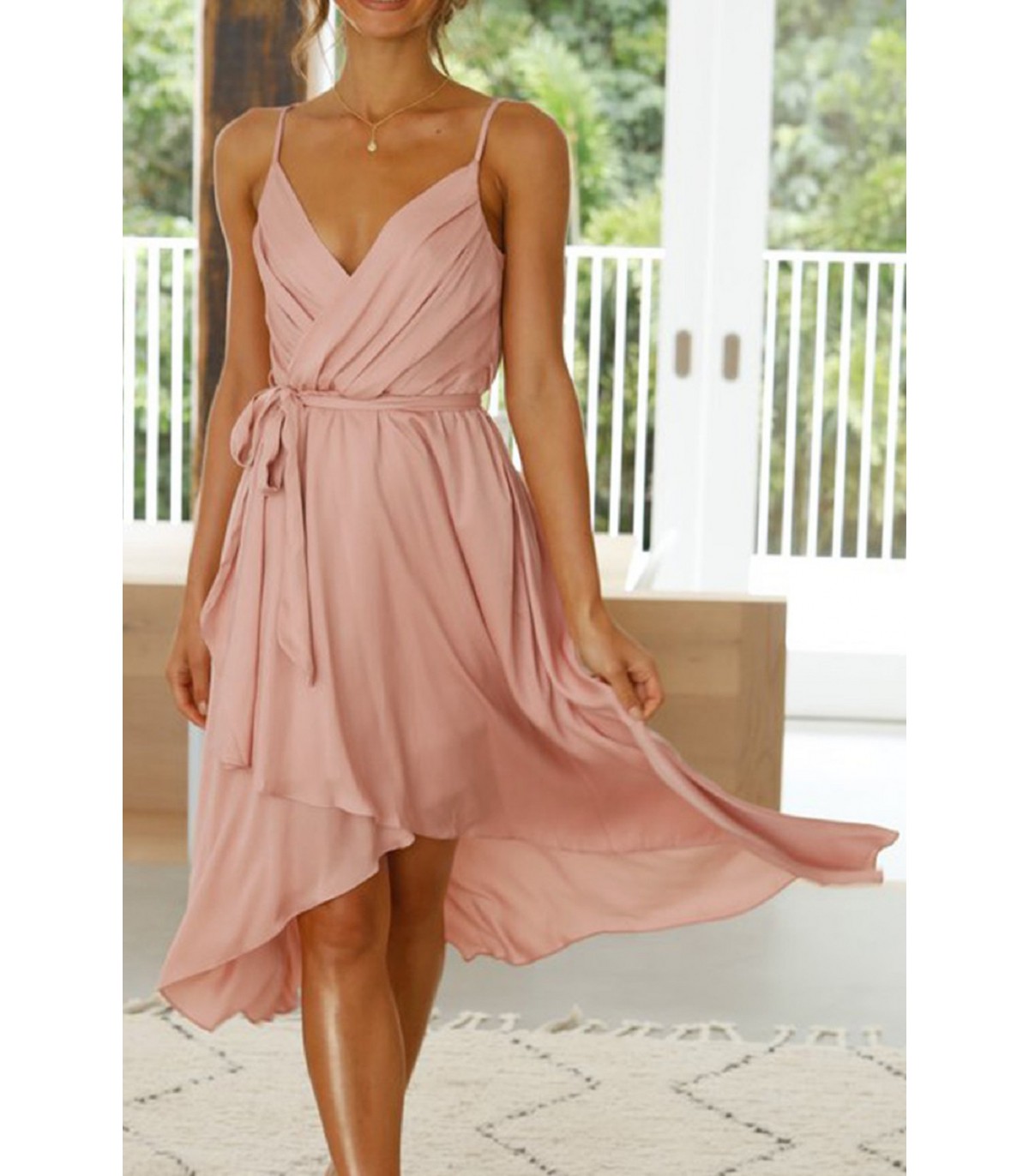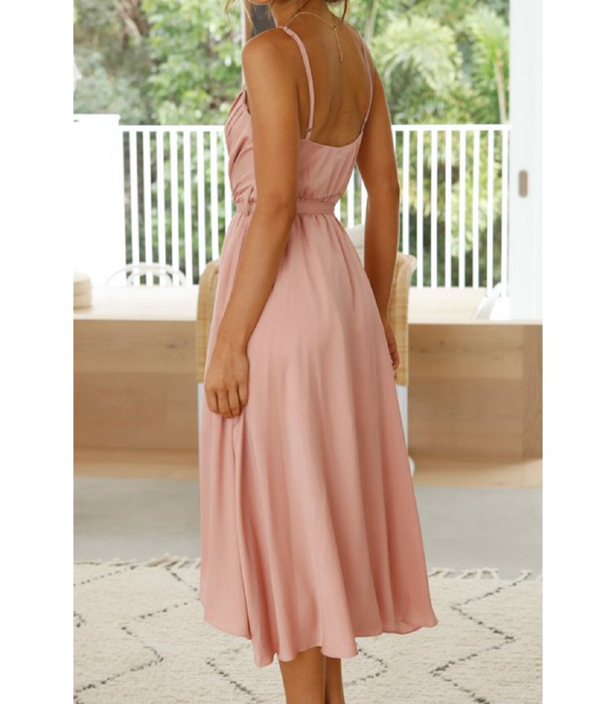 Rosa dubbelaxlad rygg längre omlott v-klänning med bälte. Kontrollera midjemåttet - klänningen jäder inte! Om du inte känner till ditt midjemått och undrar mellan två storlekar, ta en större storlek om du inte är smal midja.