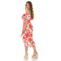 En vitröd rosmönstrad som avslöjar axlarna bak är en längre volangprydd klänning med kedjebälte.