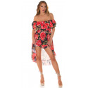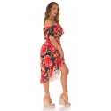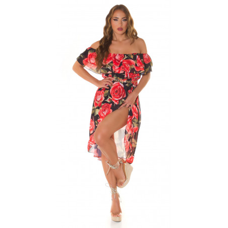 Svart rosmönstrad off-shoulder hög låg klänning med kedjebälte