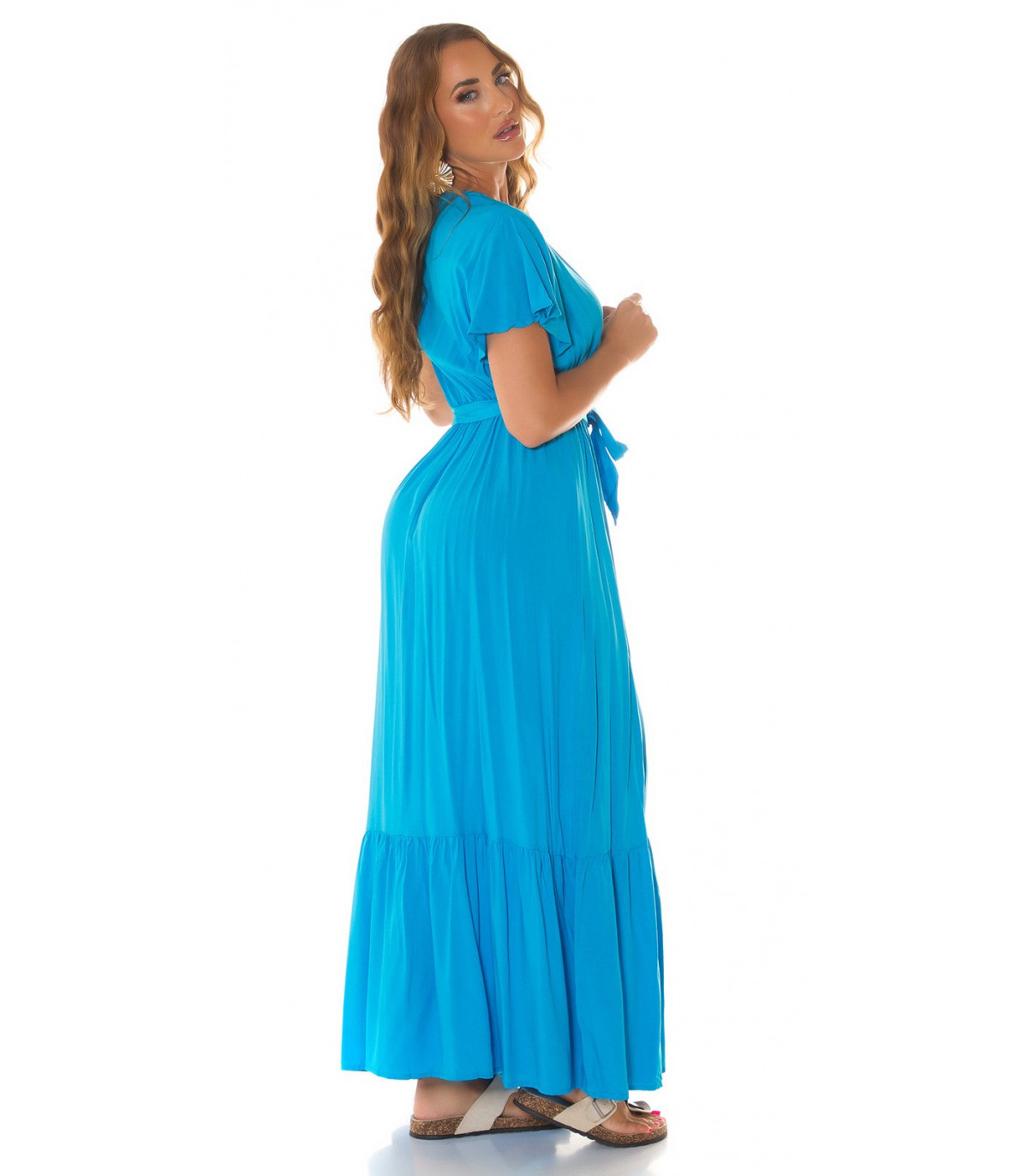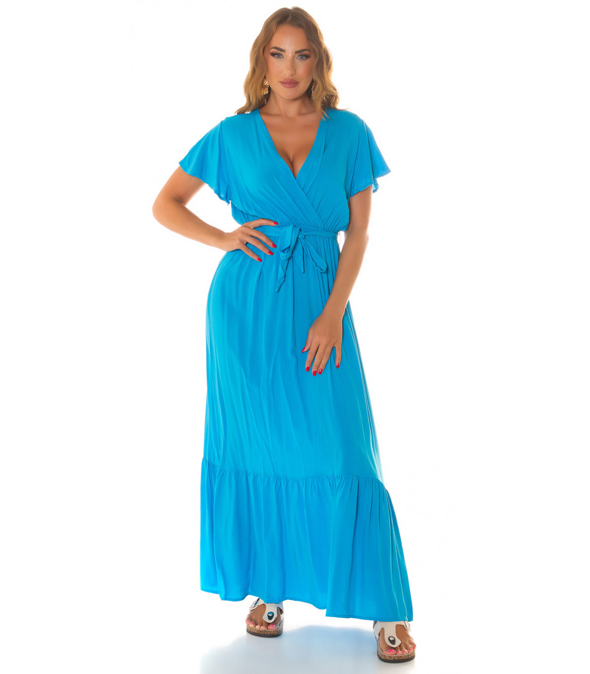 Koucla turkos kortärmad V-maxiklänning med bälte
