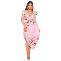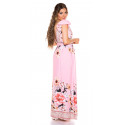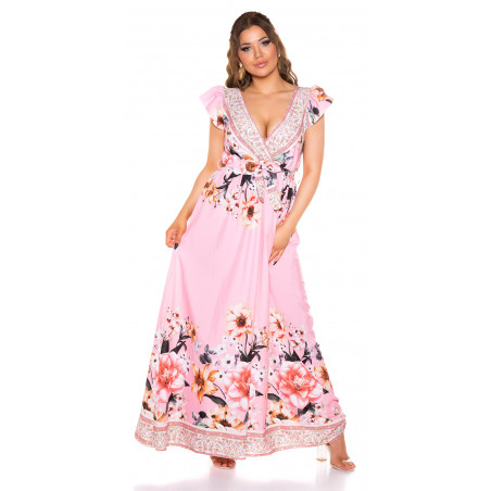 Rosa blommönstrad v-maxiklänning med volanger och bälte. Passar bäst för ca 165 cm.