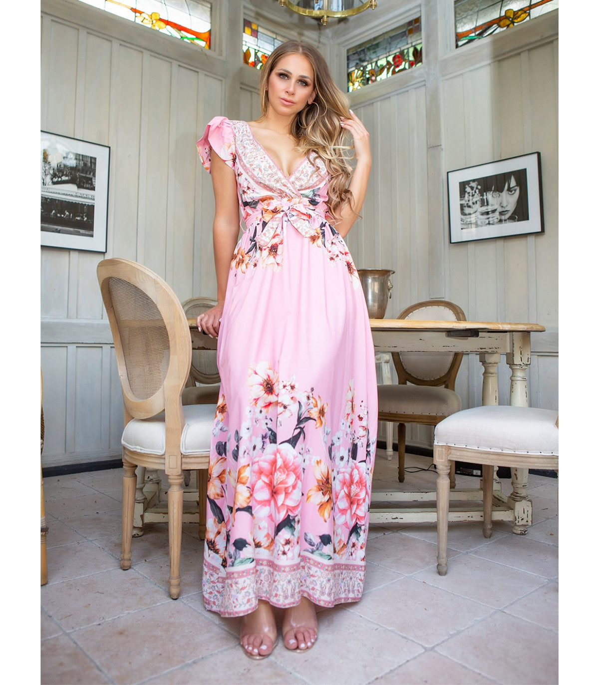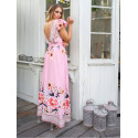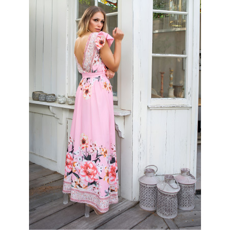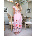 Rosa blommig mönstrad v-maxiklänning med bälte