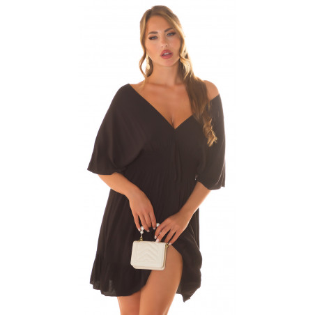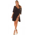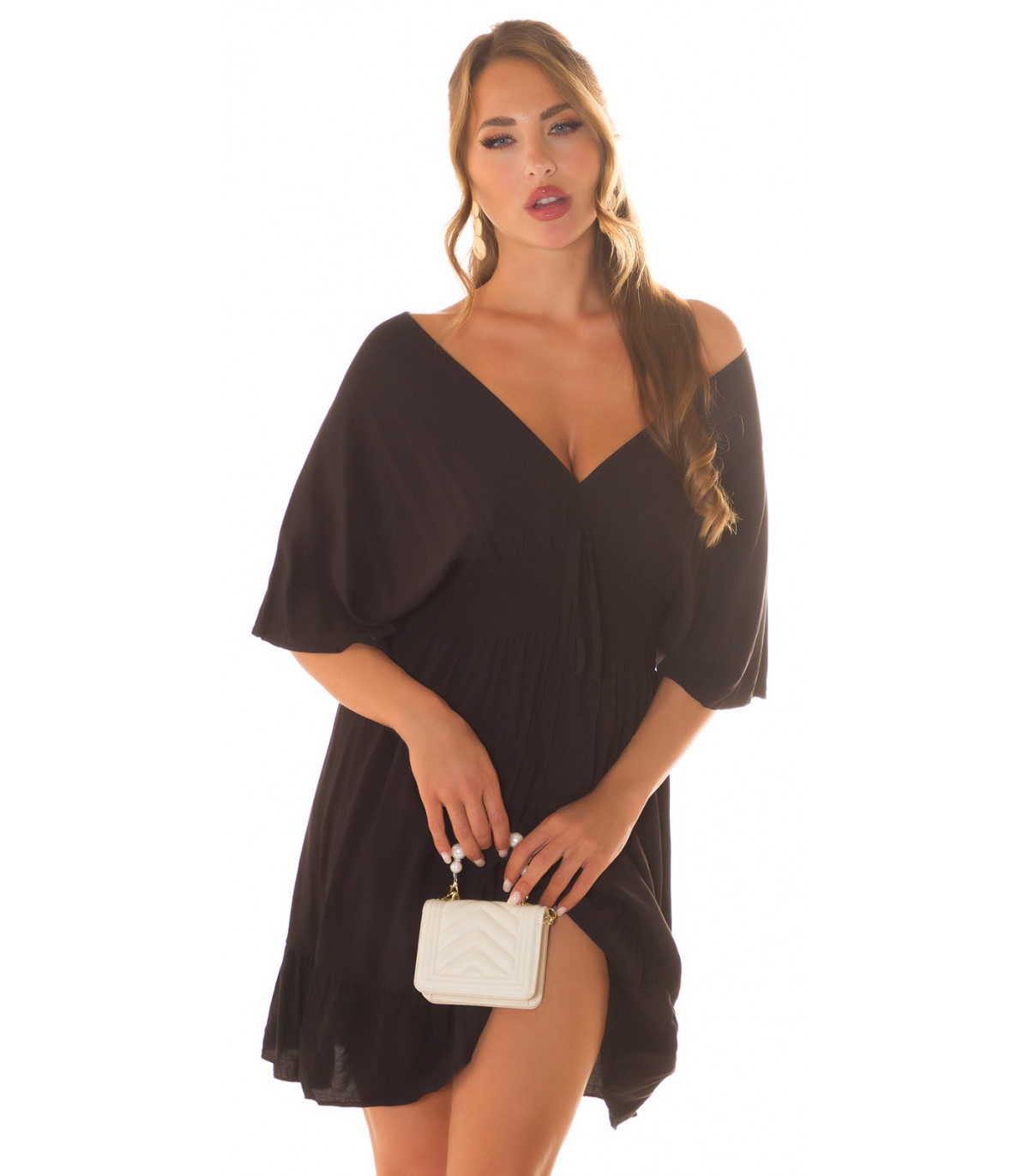 Svart kortärmad v-klänning. Under bröstet elastisk midja. Prova klänningen med midjebälte också.