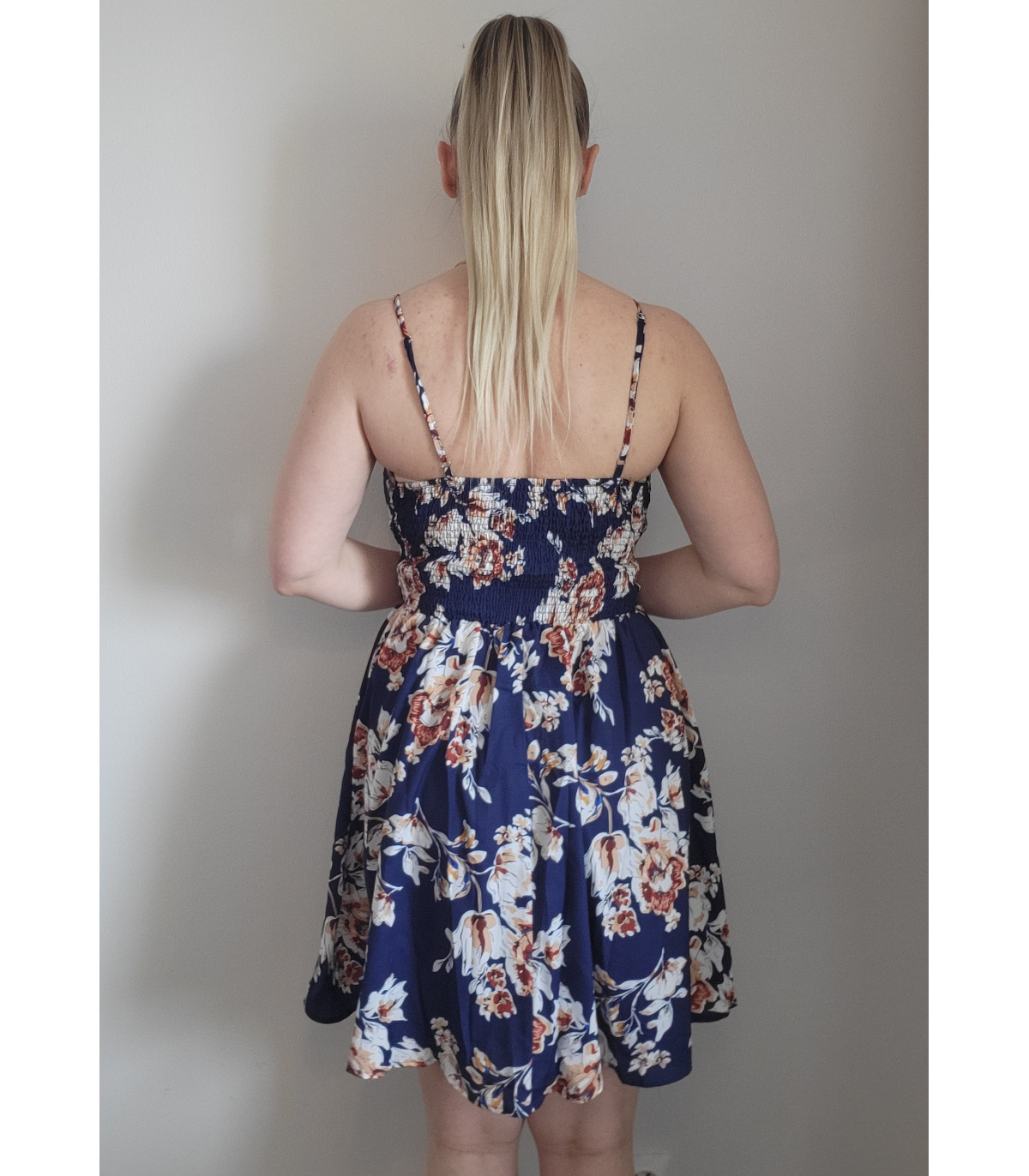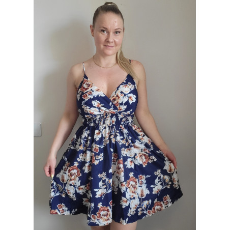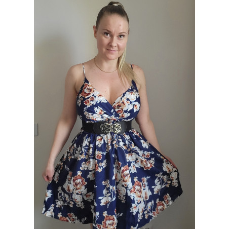Mörkblå blommig mönstrad wrap-look v-klänning
