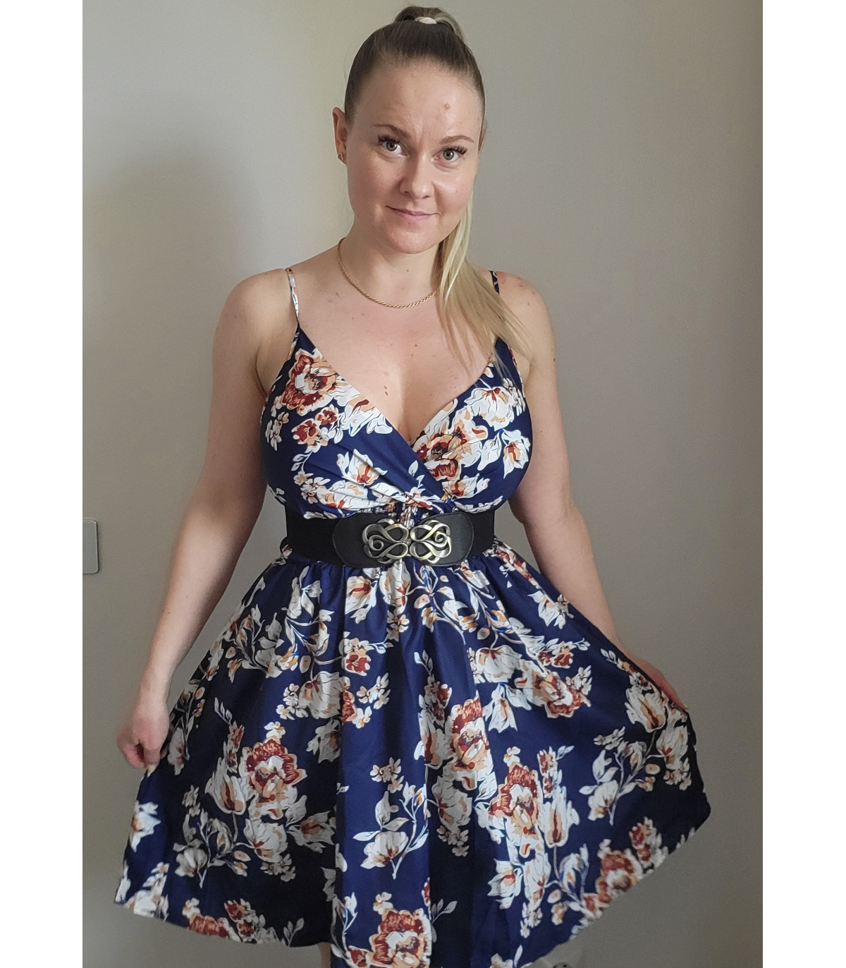 Kaunis, muotoja korostava kevyt mekko. Sopiva koko XL (käytän vaihtelevasti kokoja 46-50), vyötärökaistale ja yläselän osuus joustavat.