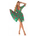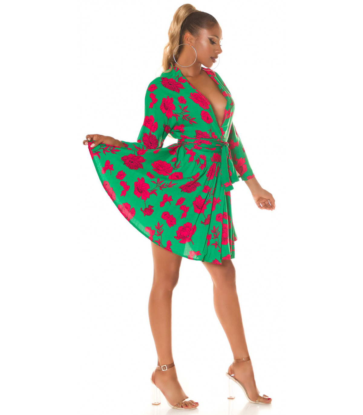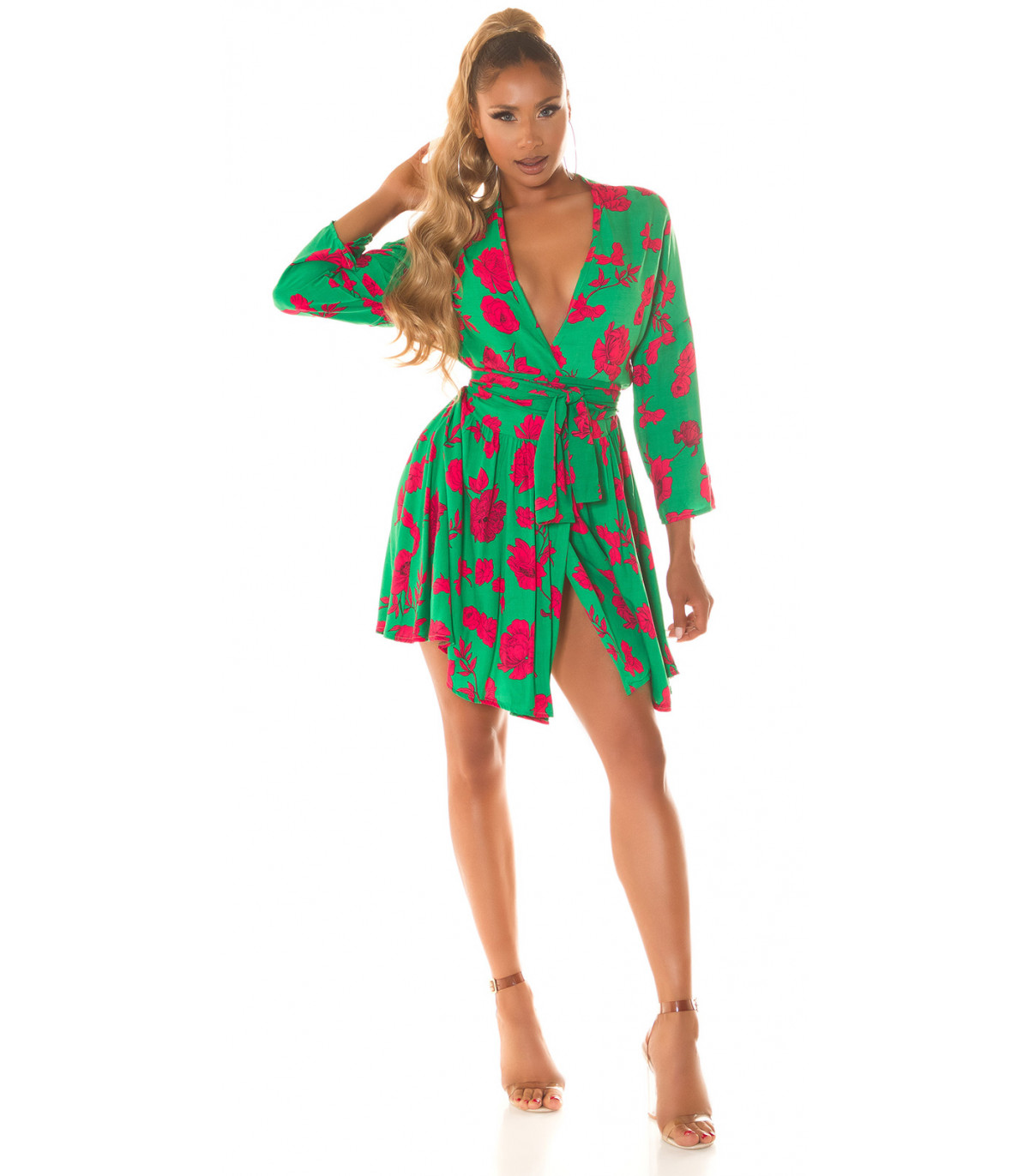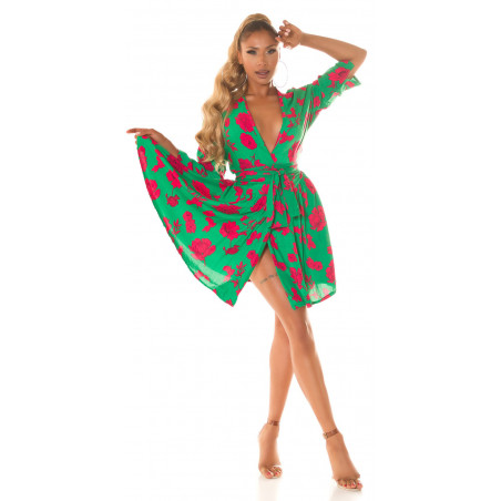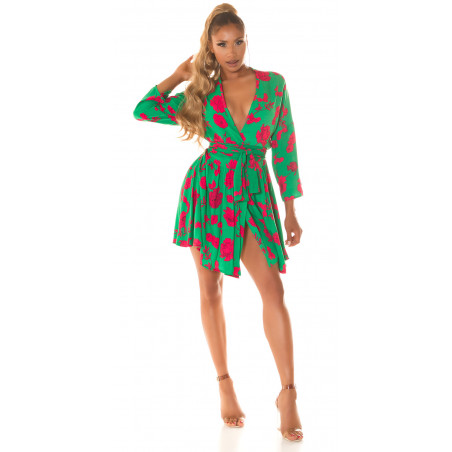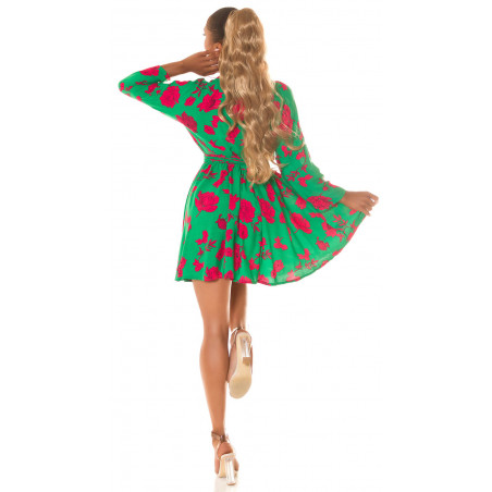Grön-röd blommig mönster wrap look v-klänning