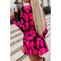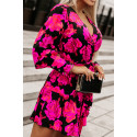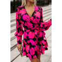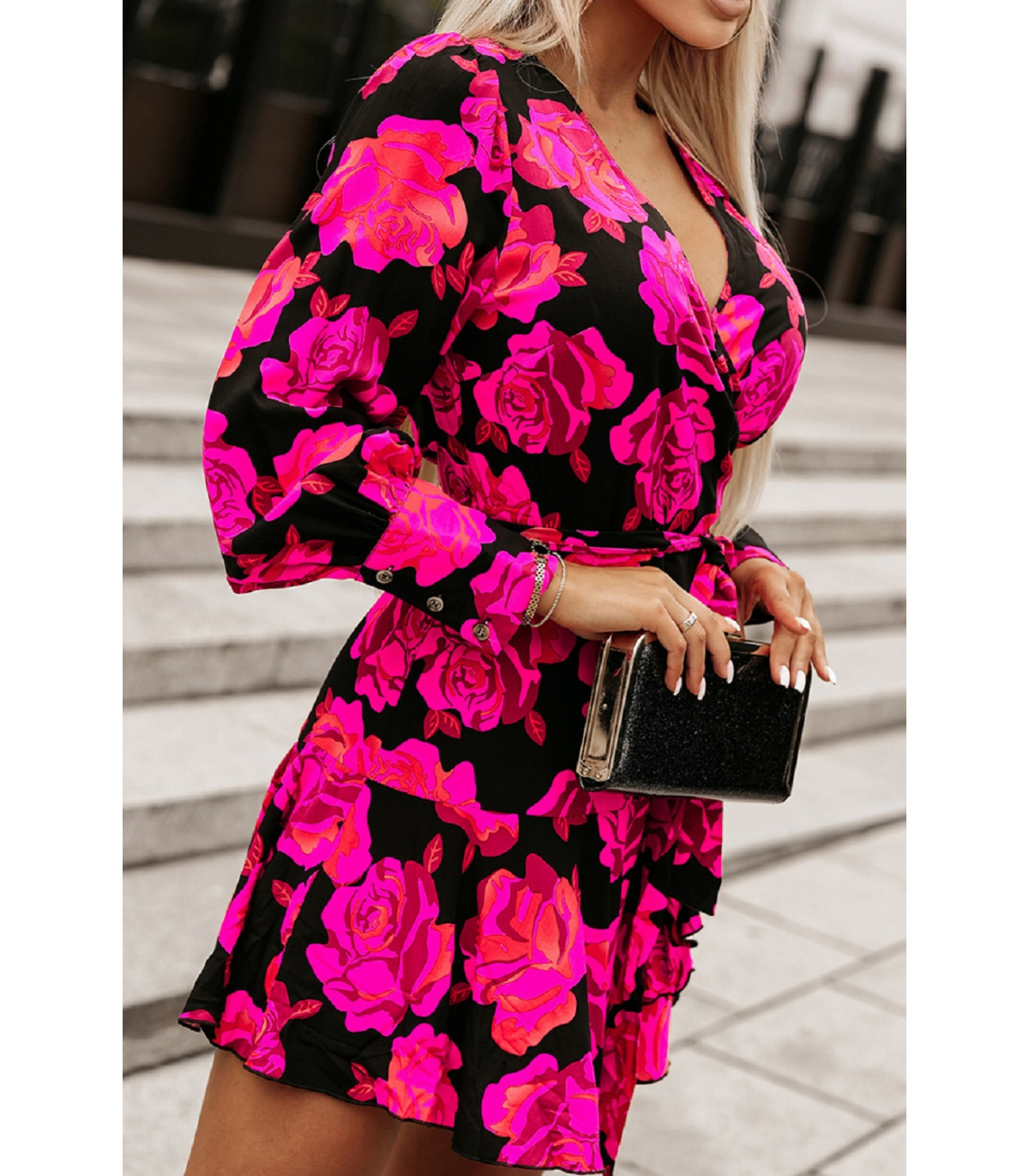 Svart-rosa rosmönstrad v-wrap klänning med bälte