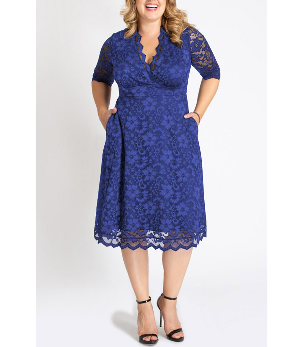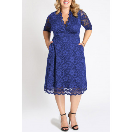 Blå halvärmad v-spetsklänning (plus size) – XL