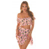 Rosa kortärmad axelavslöjande kort skjorta med blommigt tryck och matchande volangkjol med hög midja. Använd tillsammans eller separat! Modellen passar bäst för personer med smala midjor, i förhållande till höfterna.