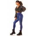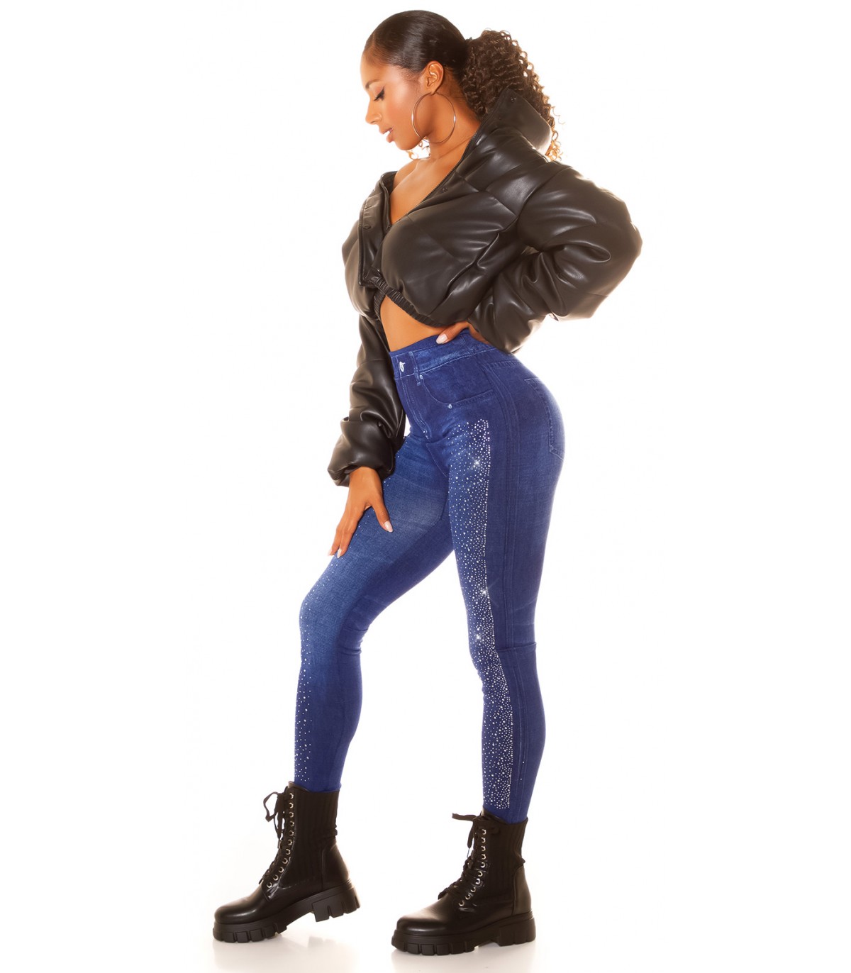 Blå jeans leggings med hög midja med strassprydnader. Fickor etc. är mönster, d.v.s. leggings har inte fickor, bältesöglor eller knappar.