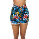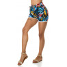 Blå korta shorts med bladmönster. Bäst lämpad för personer med smal midja i förhållande till höfterna. Bäckenomkretsen motsvarar den normala storleken.