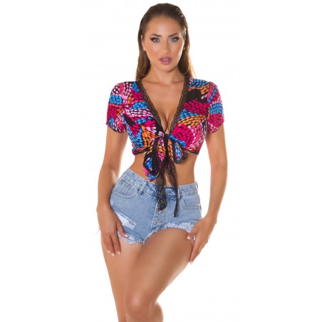 Svart färgmönster kort v-wrap skjorta med spets