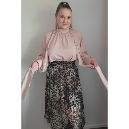 Khaki långärmad löst sittande blus med baggy ärmar och knuten fluga. En fluga knuten till kragen på en blus är en fantastisk detalj som får beröm. Blusen har även härliga väskärmar och manschetterna är dekorerade med snygga knappar.