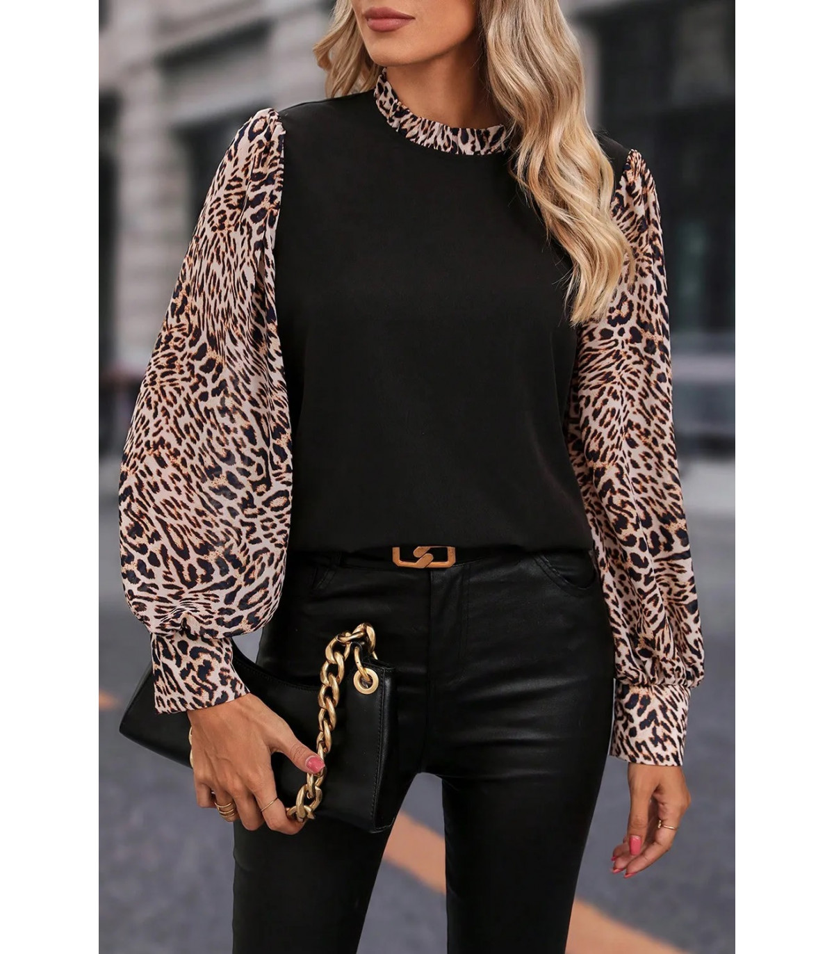 Svart blus med leopardmönstrad väskärm. Härlig chiffong leopardmönstrad påsärmar och krageeffekt ger prålighet till den svarta blusen. Leopardmönstret kommer garanterat att märkas och Leo-mönstret i kombination med svart är en snygg kombination. En snygg blus passar bra i situationer som kräver en snyggare klänning.