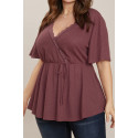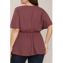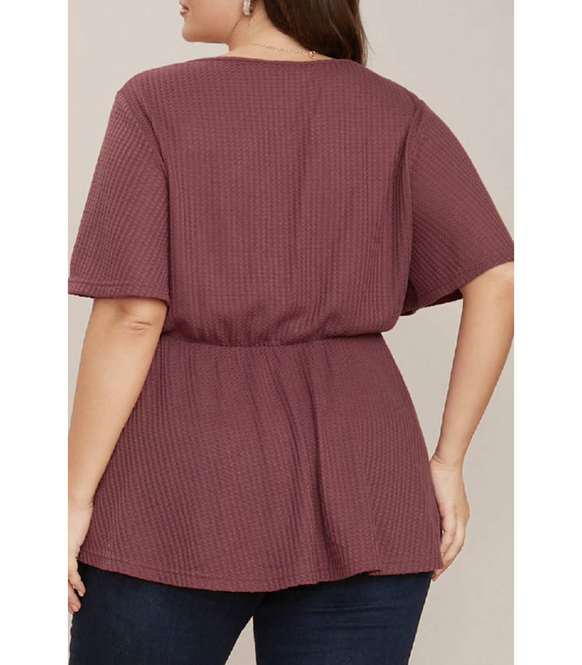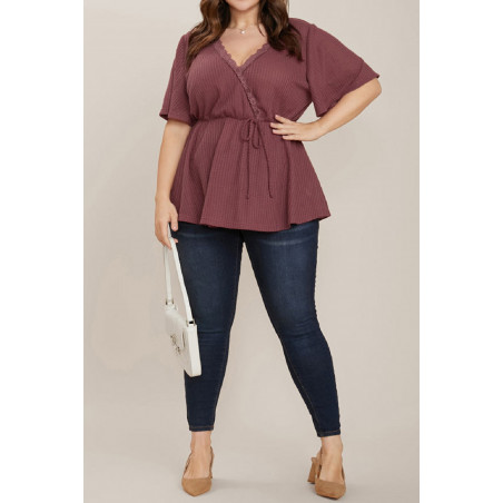 Brunröd kortärmad v-våffelskjorta med spets (plus size)