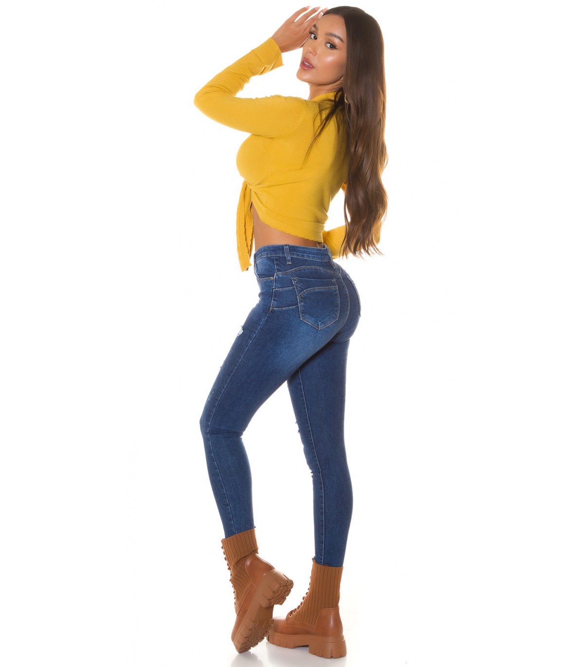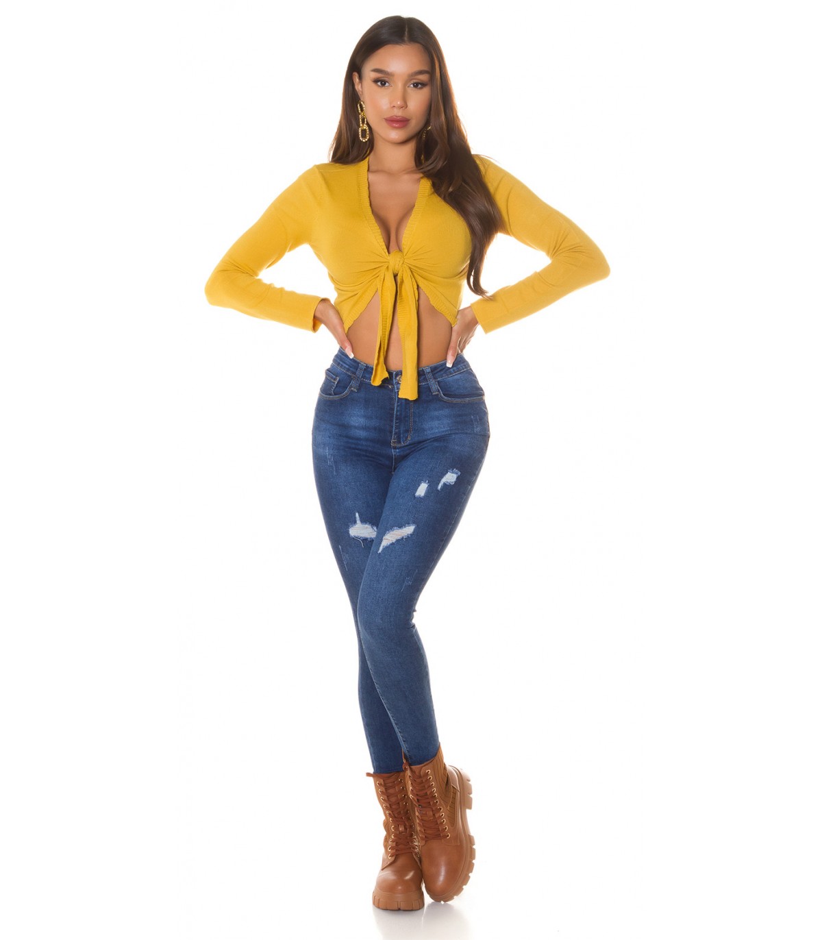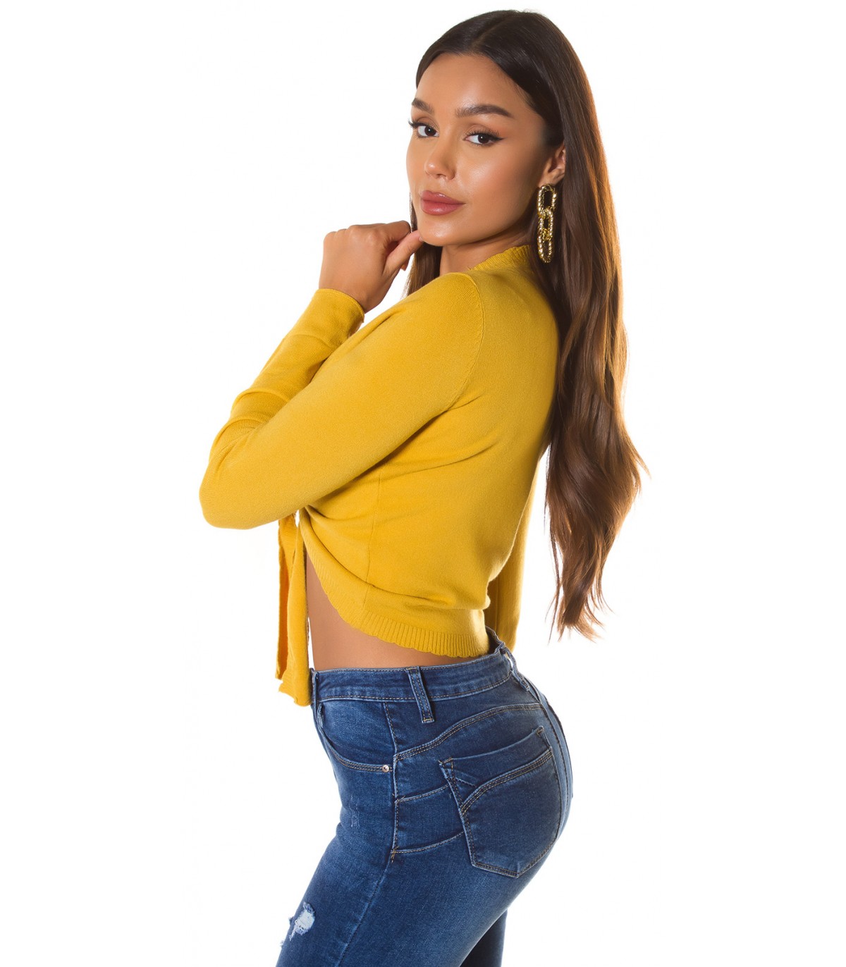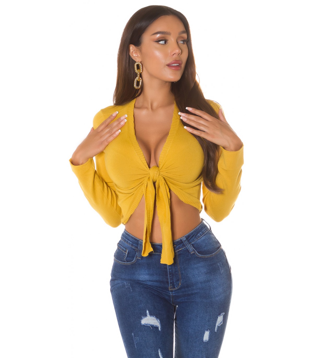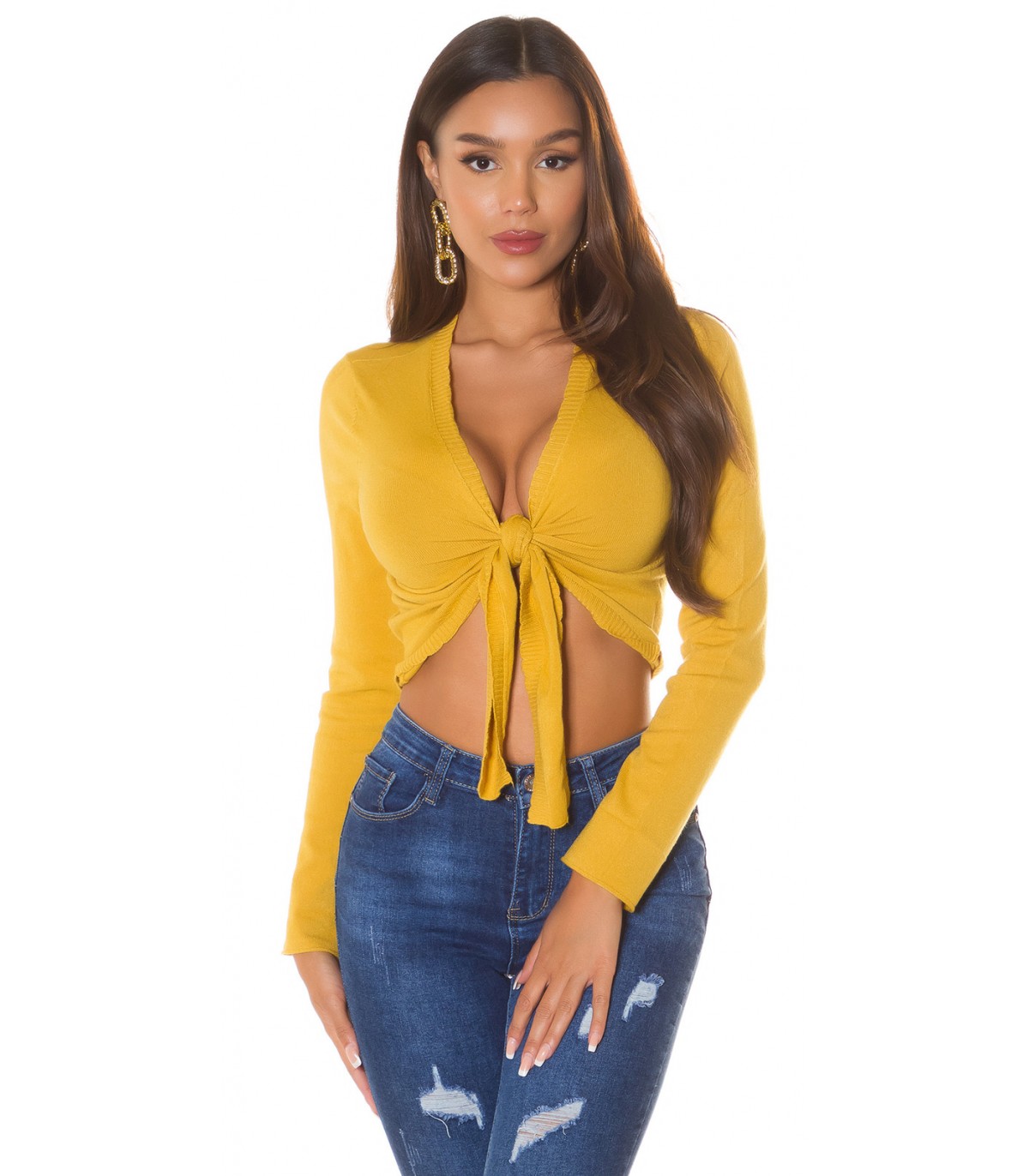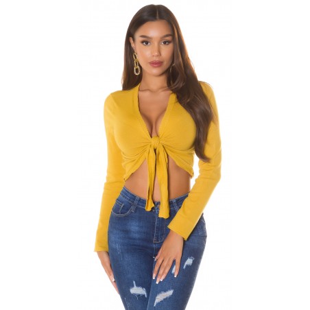 Senapsgul långärmad slips korta stickade kläder. Tips: Prova att knyta de stickade plaggen också i omlottstil som korsas bakom ryggen.