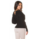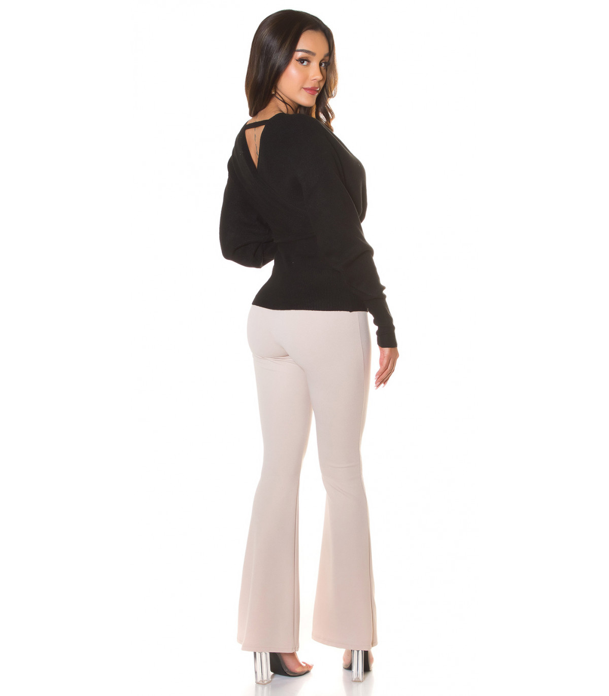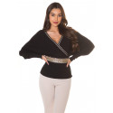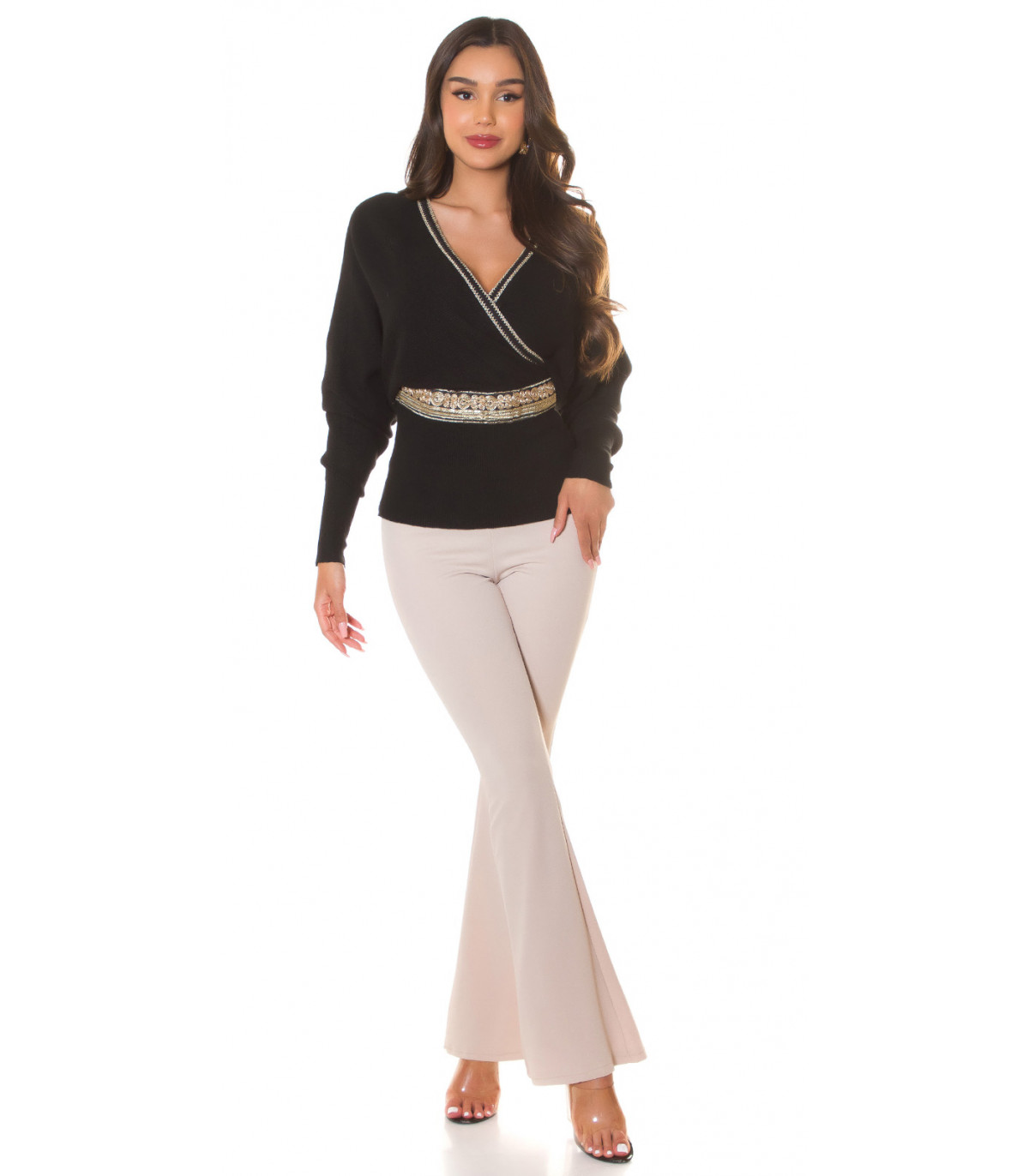 Svart långärmad dekorativ fladdermusärm omlottlook v-stickad. En vacker broderad svart tröja med fladdermusärmar och andra iögonfallande detaljer är det perfekta valet för kallare väder. En imponerande, festlig tröja med v-ringning passar till en dejt, middag eller andra tillfällen som kräver en nättare klänning. Med enkla accessoarer passar tröjan även till vardags. Denna feminina tröja är perfekt när du letar efter en vacker stickad skjorta där du kommer att känna dig vacker och självsäker. De imponerande detaljerna på tröjan och den feminina modellen får beröm.