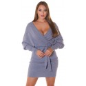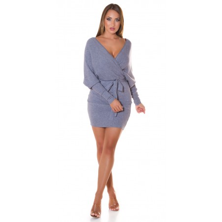 Grå v-stickad klänning med omlottklänning med fladdermusärmar och bälte