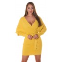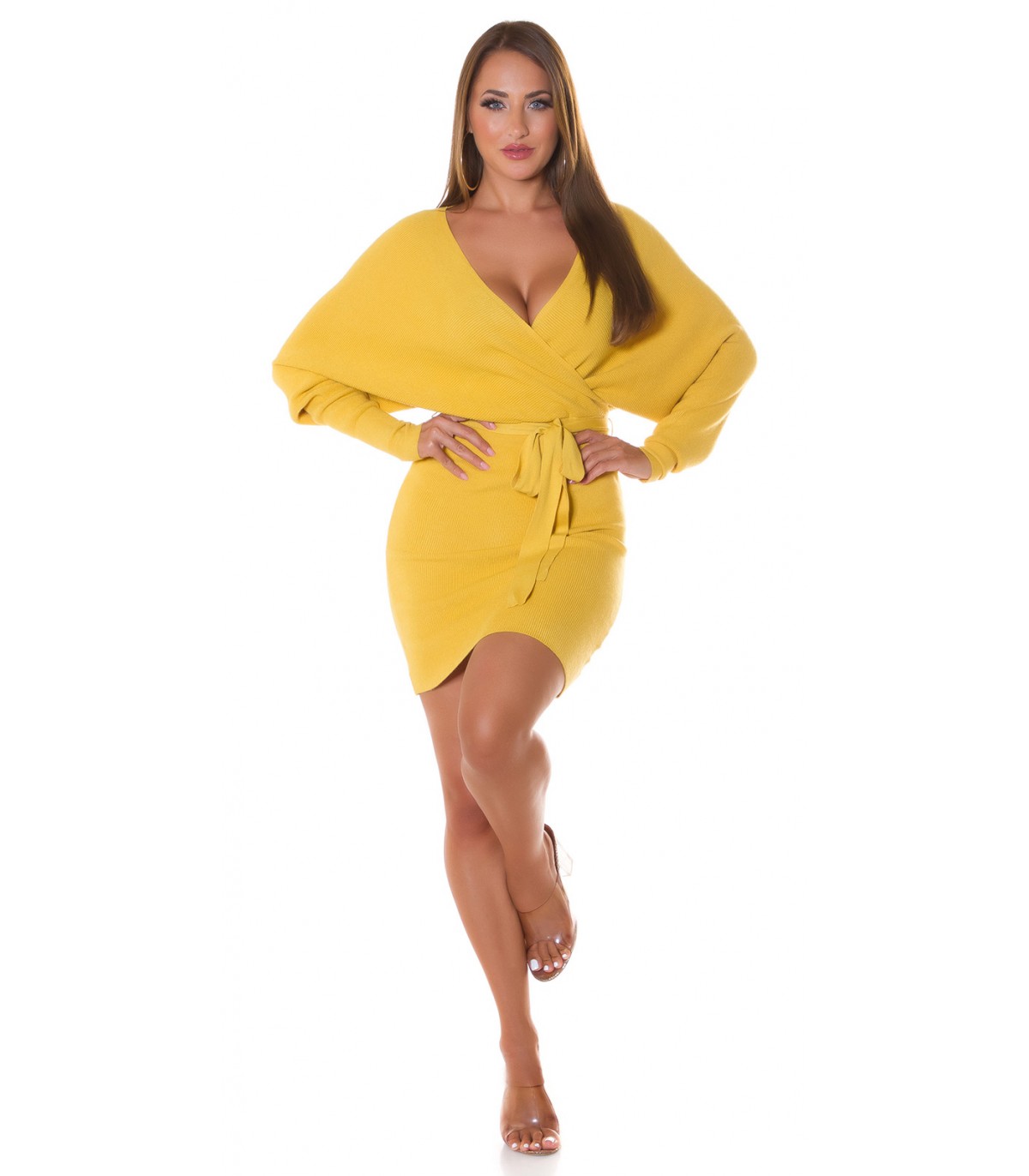 Gul v-stickad klänning med omlottklänning med fladdermusärmar och bälte