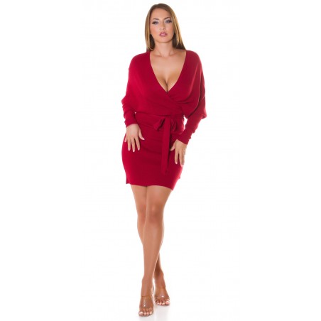 Röd v-stickad klänning med omlottklänning med fladdermusärmar och bälte