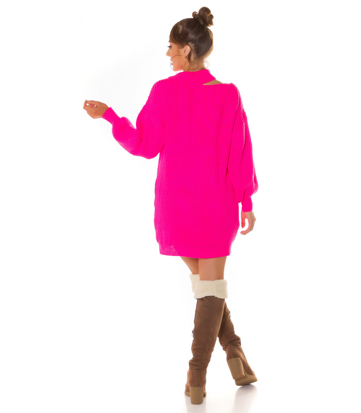 Rosa långärmad löst sittande ullklänning med en imponerande slits i sidringningen. Den kluvna halsen är en fantastisk detalj som fångar ögat. En enkel, monokrom oversized ullklänning är en stylists dröm. Det är lätt att skapa en snygg outfit runt den som är superbekväm att bära. Välj accessoarer som matchar stilen för att komplettera outfiten. Om du vill framhäva kroppsformerna mer kan du lägga till ett midjebälte till din outfit för att framhäva midjan. En rosa ullklänning är en underbart pigg ljuspunkt och kommer definitivt att sticka ut från mängden. En varm ullklänning är underbar i kyligt väder.