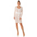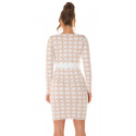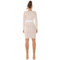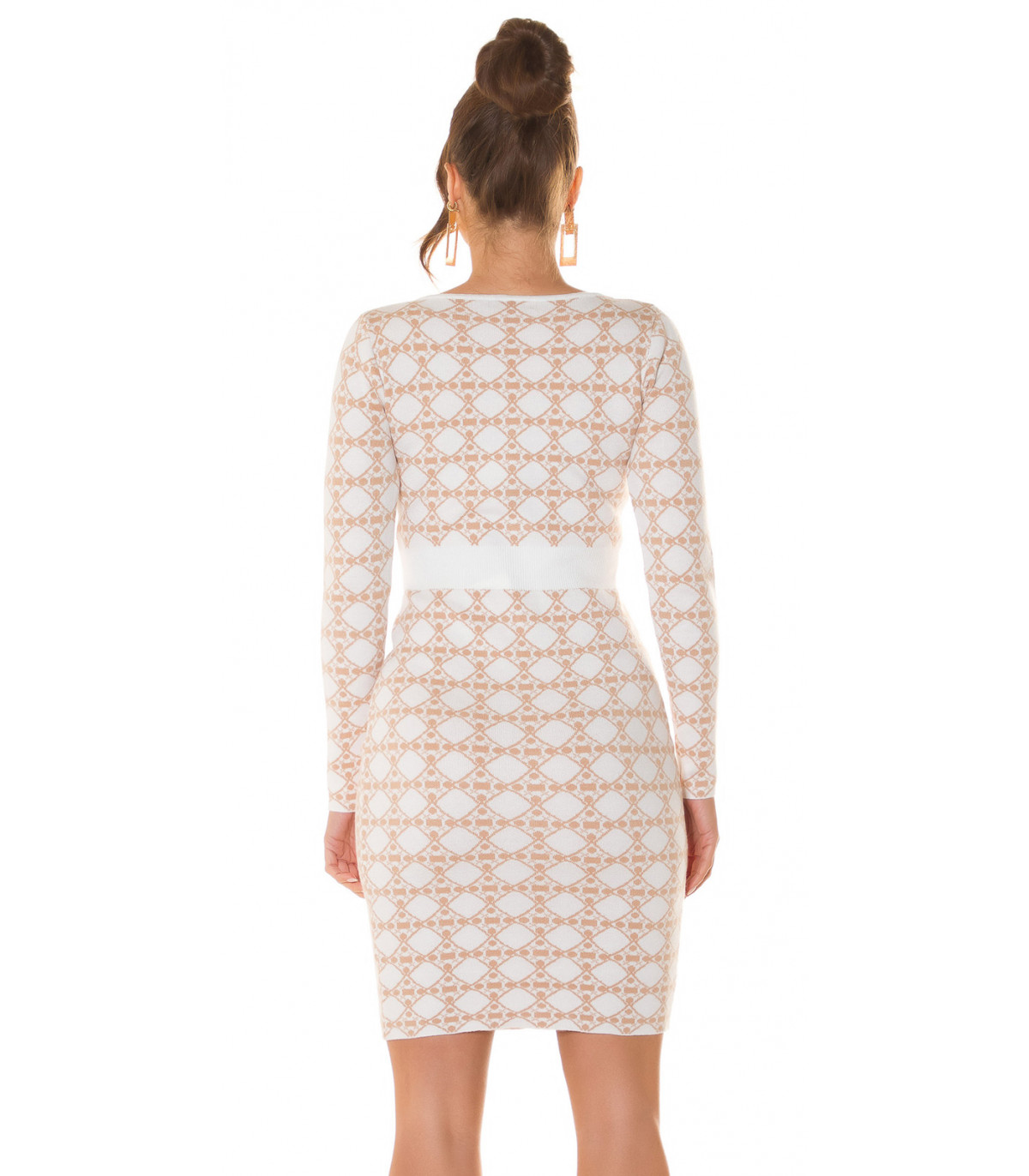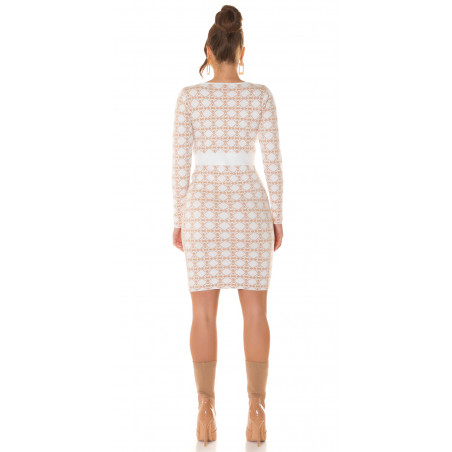 Vit långärmad stickad klänning med tryckmönster med knappar. En snygg stickad klänning passar till många olika tillfällen. En vacker stickad klänning med knappkant är ett elegant val av kläder för bland annat dejter, vardagskläder och kvällssammankomster. En långärmad stickad klänning passar för många arbetsplatser och tillfällen som kräver representation. Tryckmönstret och knapparna är förtjusande detaljer. En midilång stickad klänning som formar sig efter figuren framhäver feminina former på ett stilrent sätt. En vitbeige stickad klänning med spektakulära detaljer blir ett multifunktionellt och stilrent tillskott till garderoben. Med den här stickade klänningen slipper du många klädkriser! En elastisk stickad klänning är bekväm att bära.