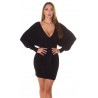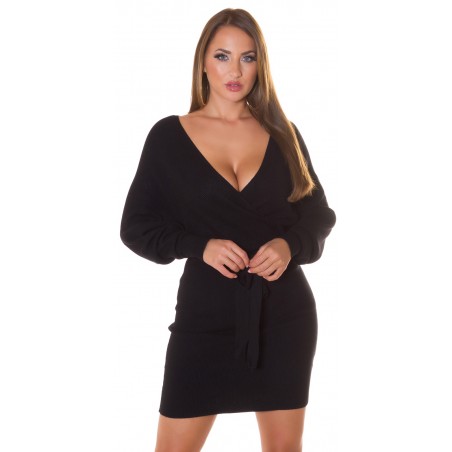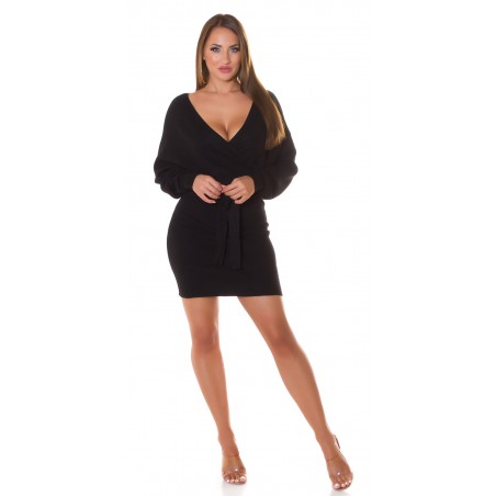 Svart omlott-look v-stickad klänning med fladdermusärmar och bälte