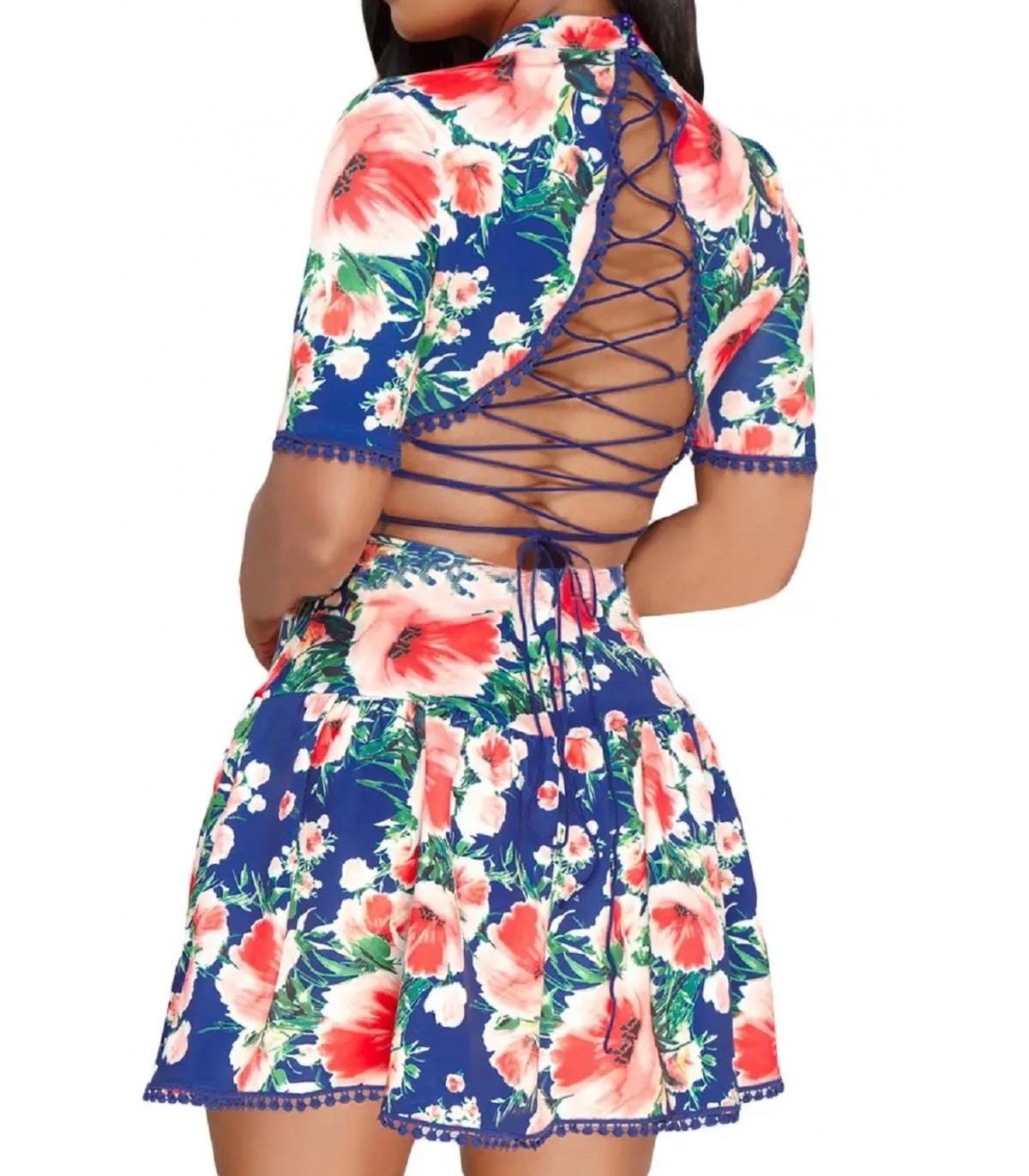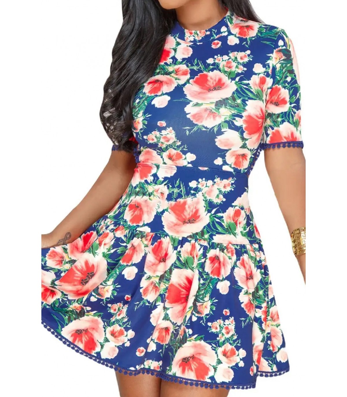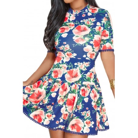 Blå kortärmad blommig mönstrad nodback skater klänning.
