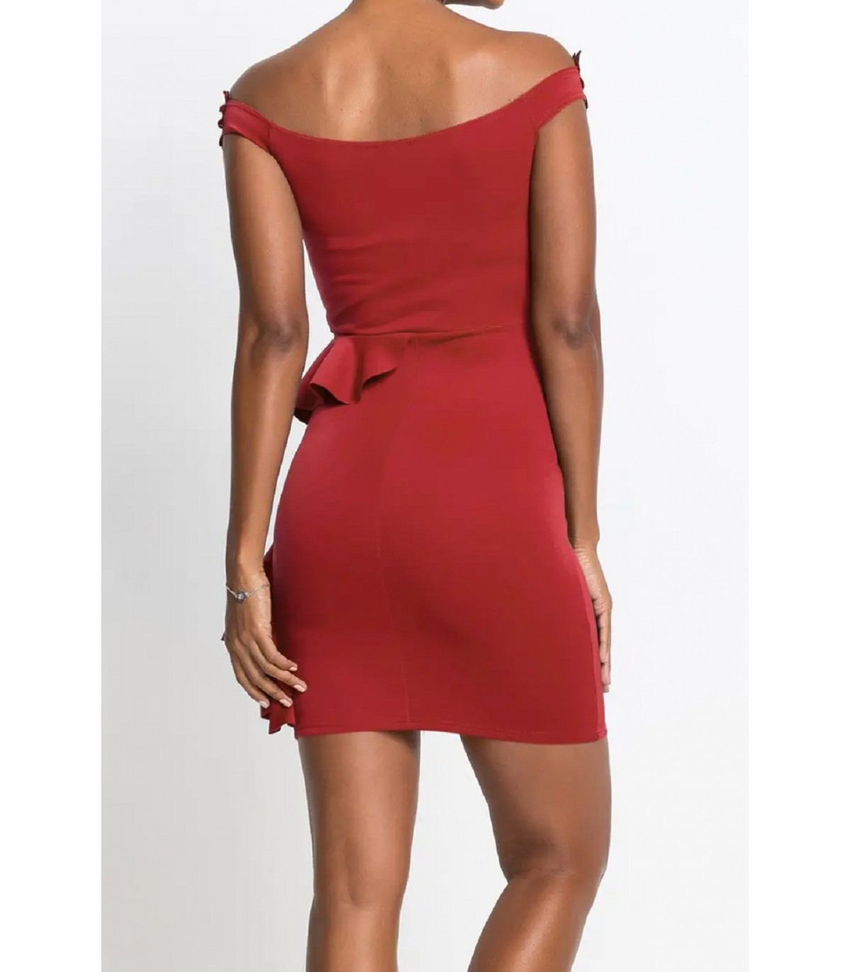 En röd axel-avslöjande spets-orned festklänning med flammande. Utgått produkt - kommer inte att fyllas på.